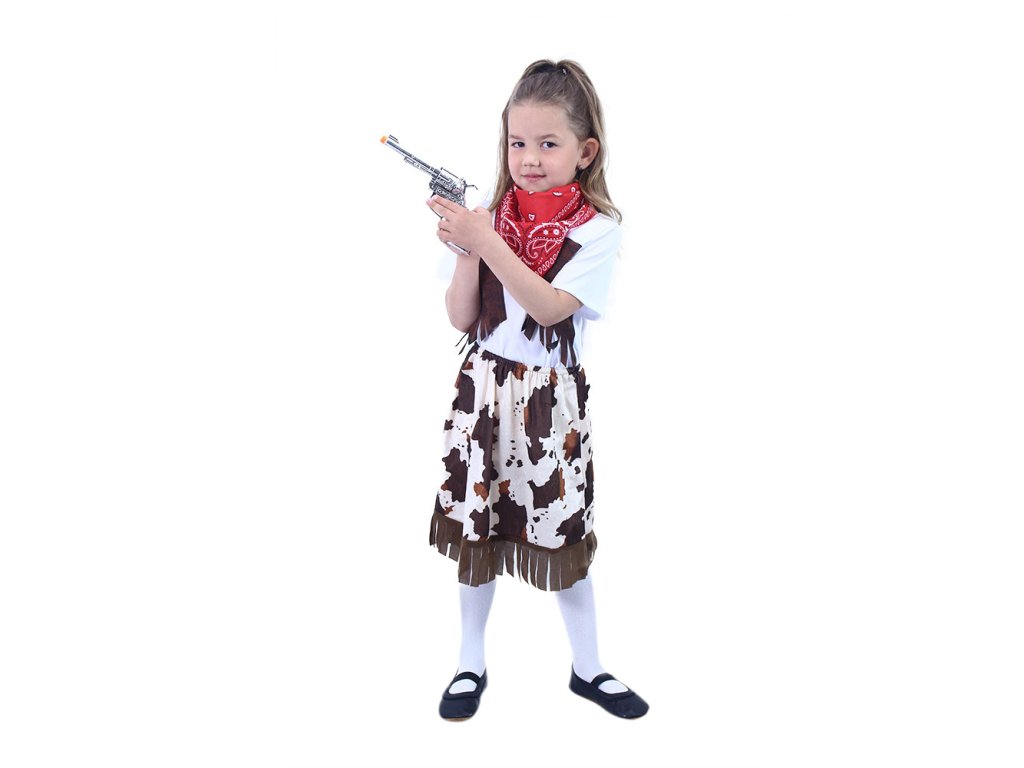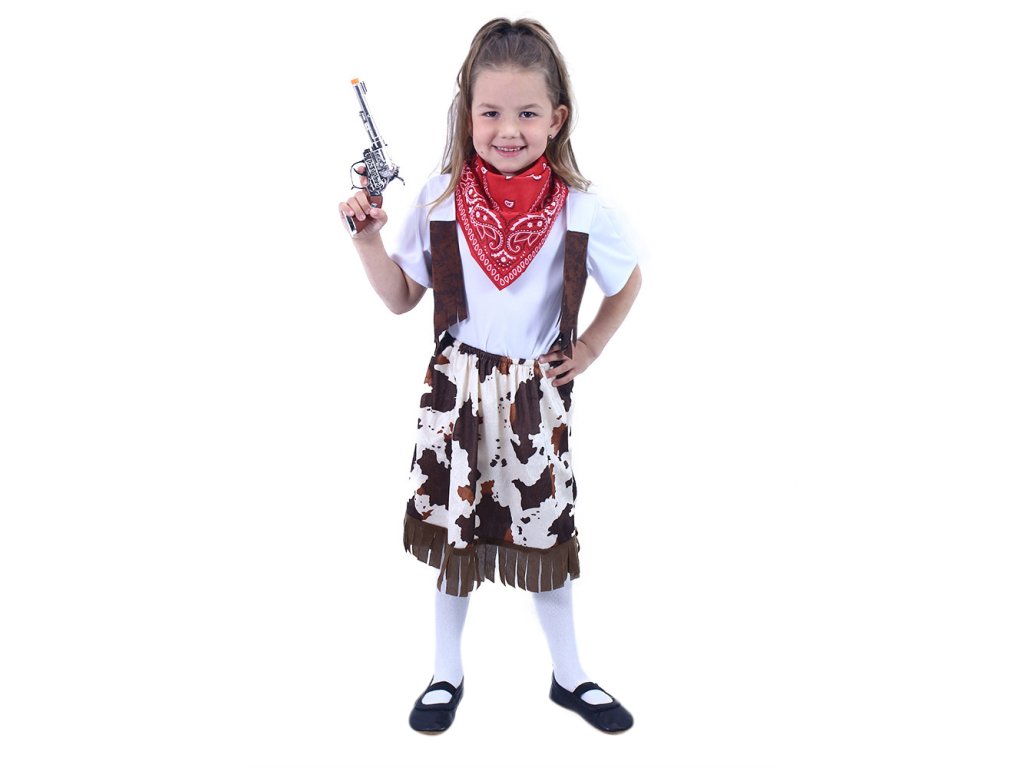 Dětský karnevalový kostým pro malé kovbojky! Kostým ve velikosti S je určen pro děvčata ve věkovém rozmezí 4-6 let (105-116 cm). Balení obsahuje tričko s vestou, hnědo-bílou sukni, červený pásek a šátek.