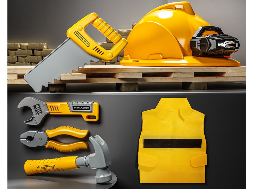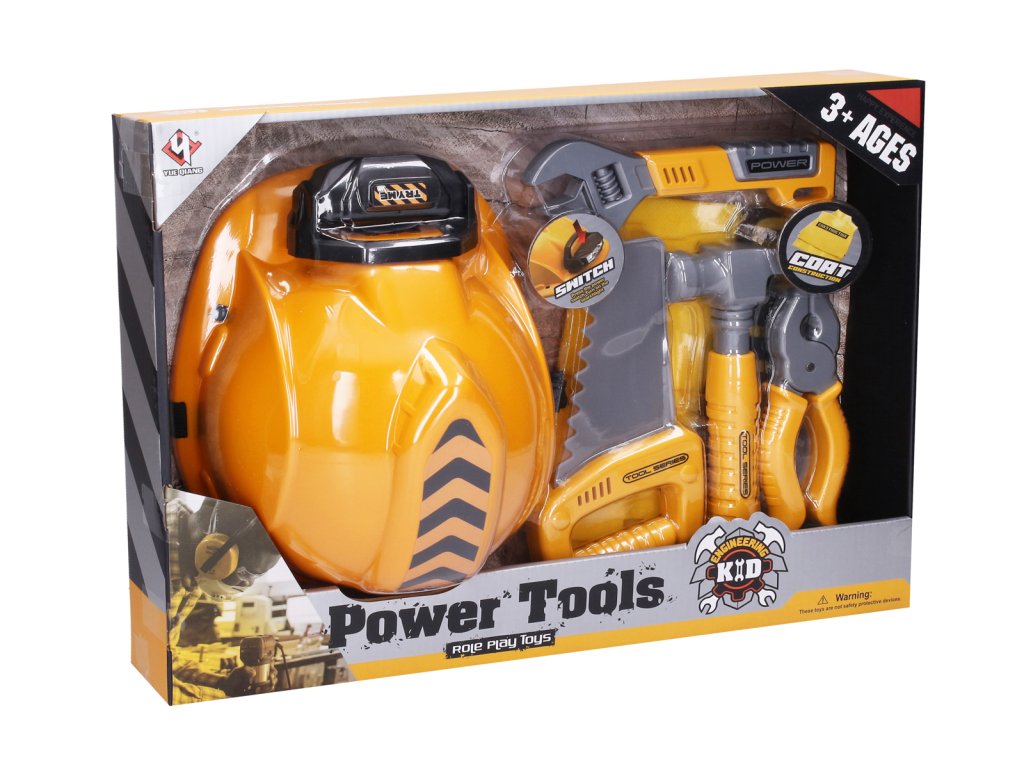 Nářadí s helmou a svítilnou. Rozměry helmy 24x19x13 cm. 3xAG13 baterie do svítilny součástí. Aktivace tlačítkem na svítilně. Polohovací sklon svítilny. Součástí elastický popruh na suchý zip. Obsah balení - helma se svítilnou, vesta, pilka, hasák, kladívko, kombinačky.