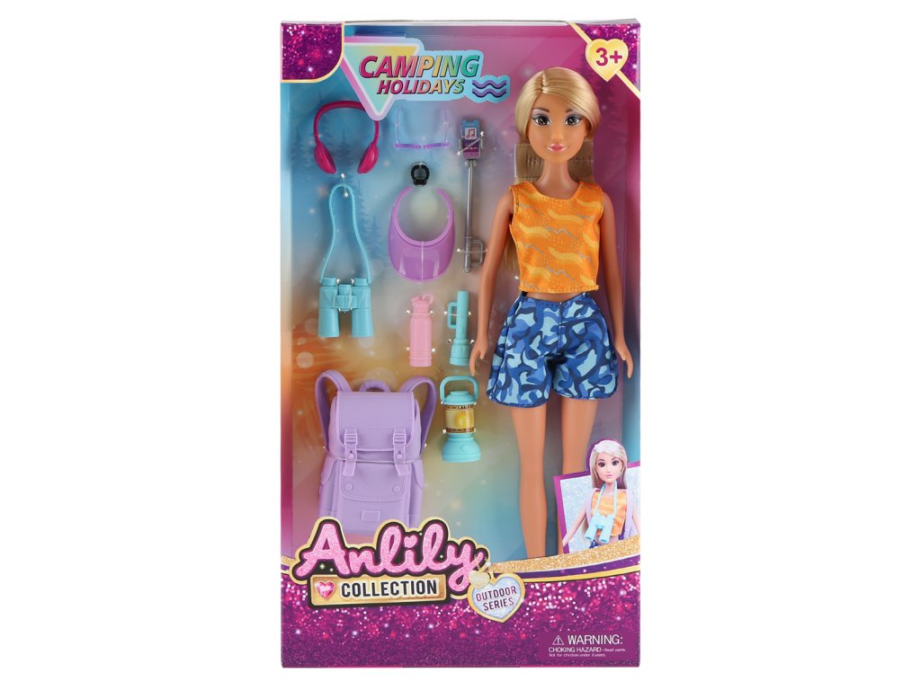 Panenka na výletě s doplňky. Velikost 30 cm. Doplňky - batoh, dalekohled, sluchátka, brýle, kšilt, láhev, svítilna, selfie tyč a další.