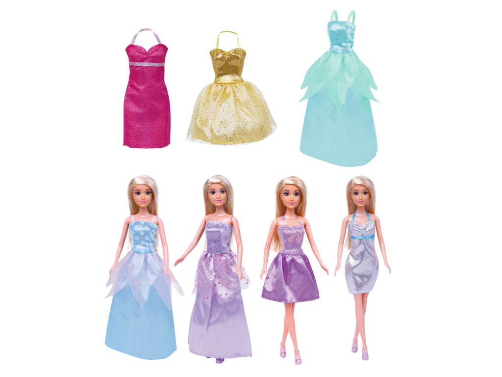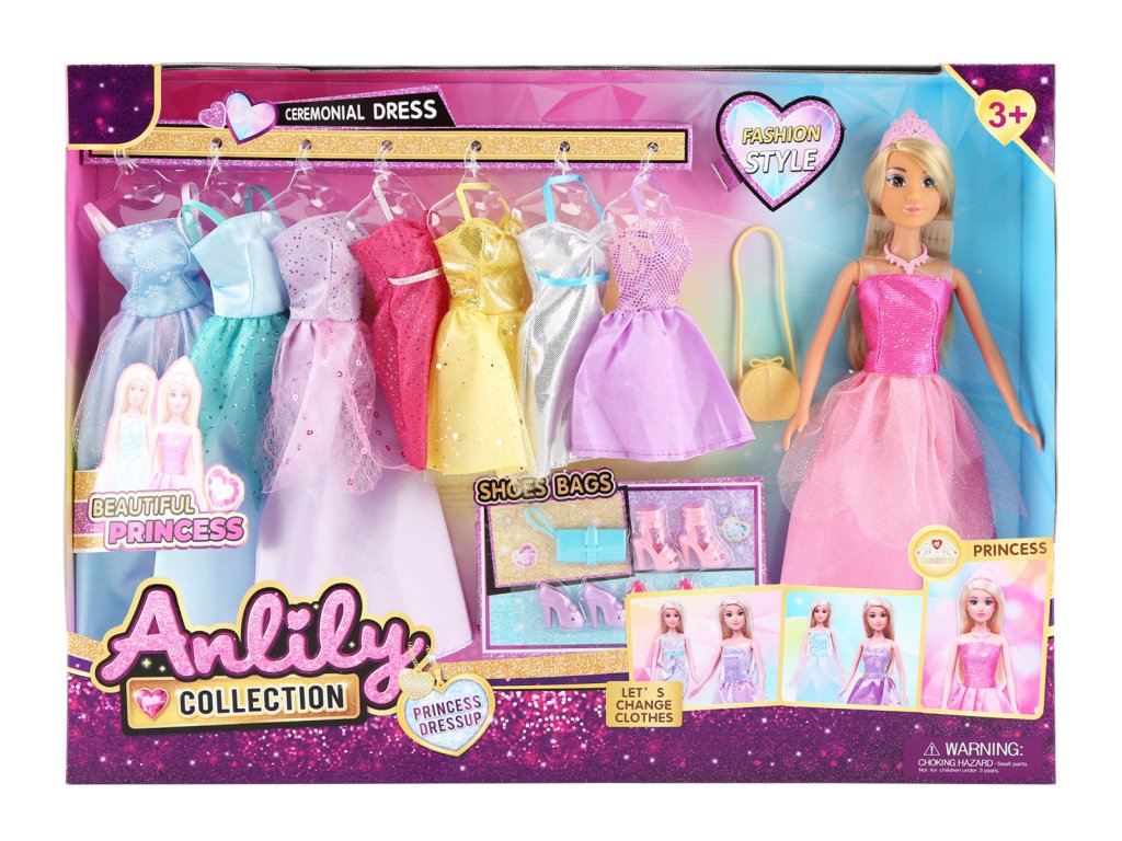 Panenka Anlily v sadě se sedmi kousky slavnostních šatů v různých barvách, třemi páry střevíců, kabelkou a korunkou. Výška panenky: 30 cm. Rozměry výrobku: 33 x 45 x 6 cm. Věk: 3+