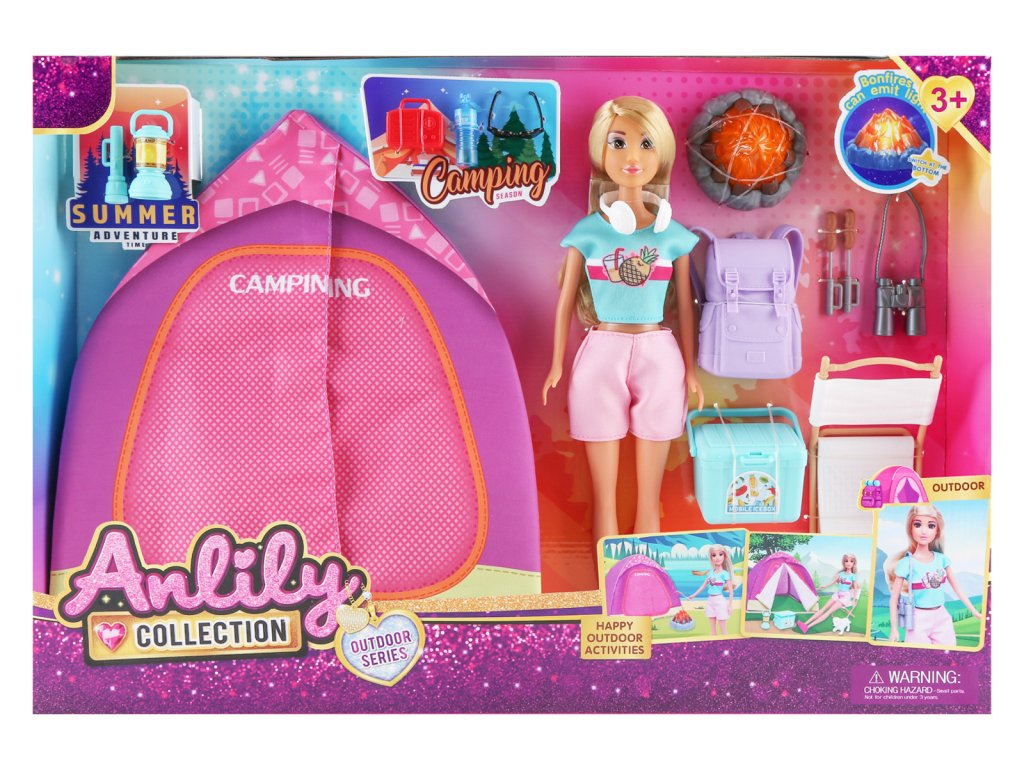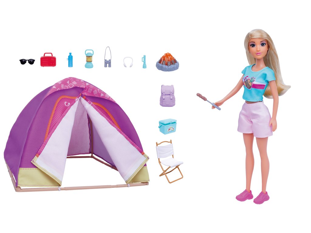 Panenka se stanem set. Velikost 30 cm. Světelné efekty ohniště. 2xAG13 baterie do ohniště nejsou součástí. Součástí stan, ohniště, batoh, dalekohled, sluchátka, kempingová taška, židle, 2 opékací vidlice, rádio, láhev, brýle, svítilna, baterka.