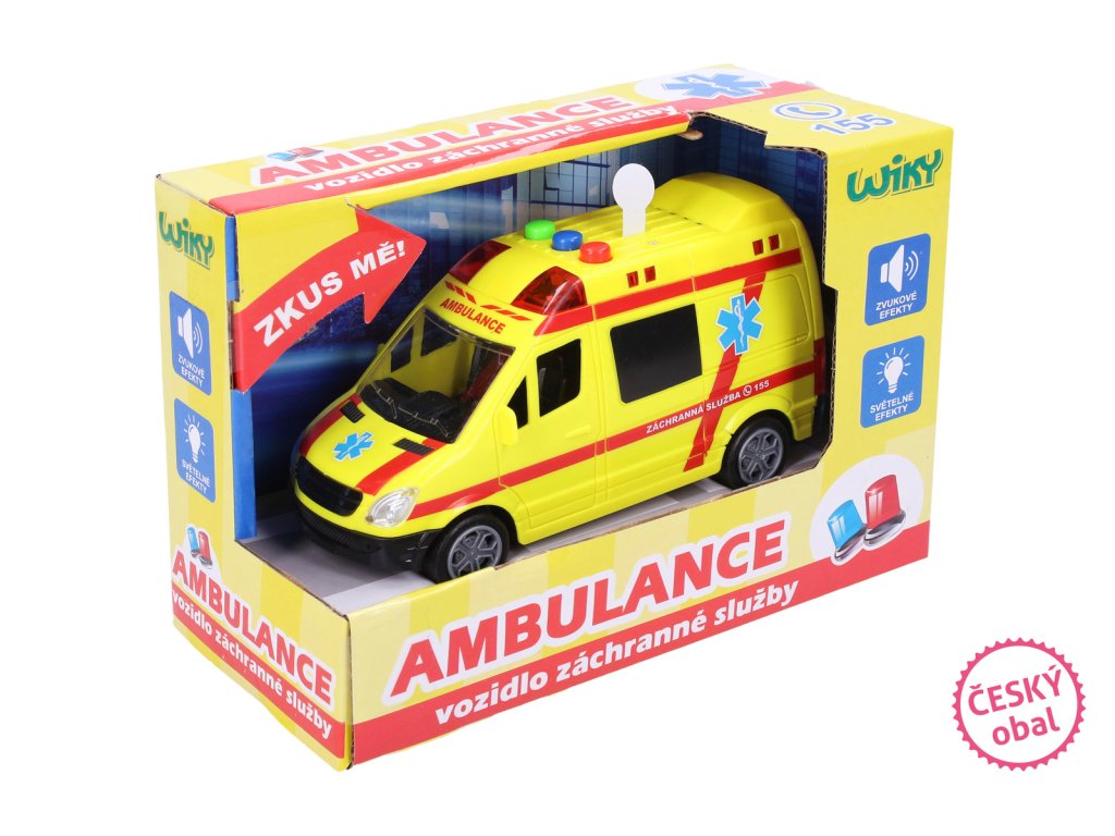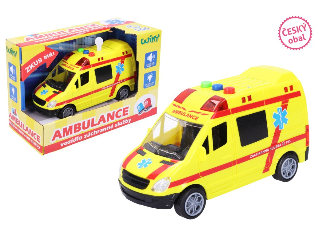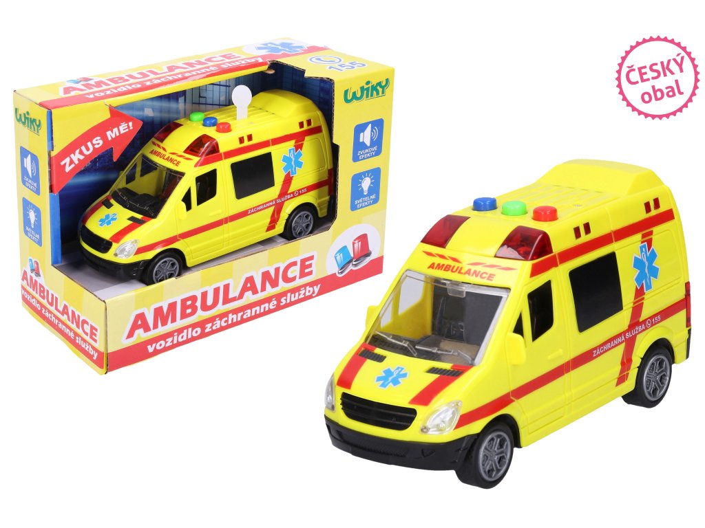 Sanitka, délka 14,5 cm. Světelné a zvukové efekty, aktivace tlačítky. Pohon na setrvačník.