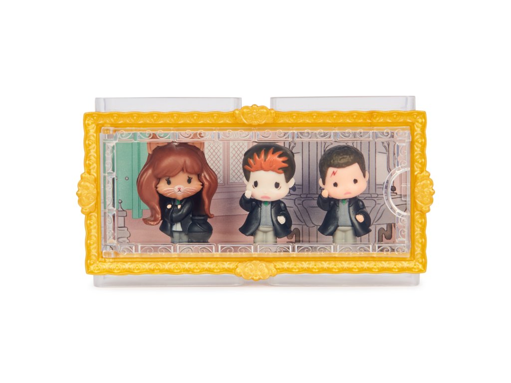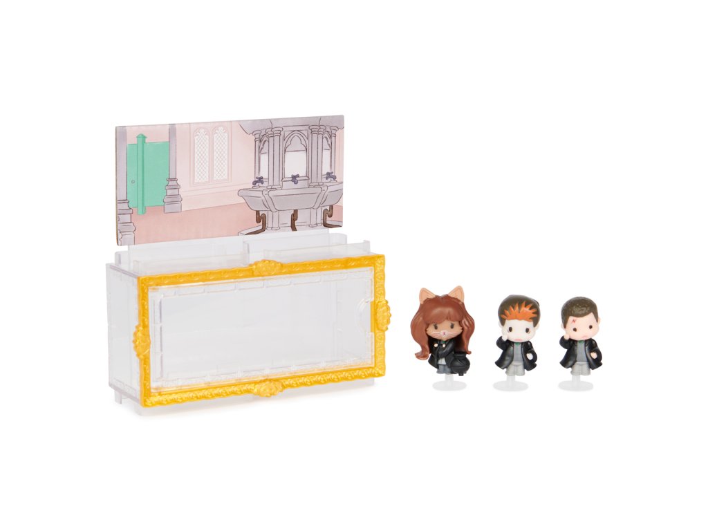 Prožijte nezapomenutelné filmové momenty se sadou figurek z kouzelnického světa Harryho Pottera a Tajemné komnaty z řady Micro Magical Moments. Toto multibalení obsahuje figurky Harryho Pottera, Hermiony Grangerové a Rona Weasleyho o velikosti 3,81 cm a průhlednou krabičku s oboustranným pozadím a tři stojany na figurky. Rozbalte své postavy a objevte jejich rozkošné detaily: Harry a Ron se proměnili ve Vincenta Crabbea a Gregoryho Goyla a Hermiona v kočku! Pozadí krabičky zobrazuje záchody, kde trojice lektvar vypila, detail, který si fanoušci a sběratelé Harryho Pottera zamilují. Postavy si můžete vystavit na stojanu, v krabičce nebo je postavit samostatně. Pro více strhujících možností vystavení se průhledné krabičky dají naskládat na sebe a pospojovat s ostatními sadami a figurkami z řady Micro Magical Moments (každá se prodává zvlášť)! Posbírejte je všechny a vytvořte si vlastní scény z kouzelnického světa! Rozměr balení: 13x12,7x4,8 cm. Věk 6+