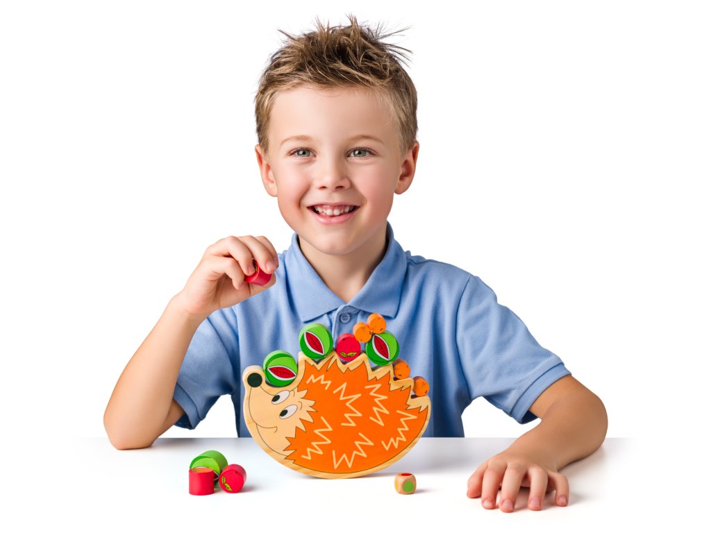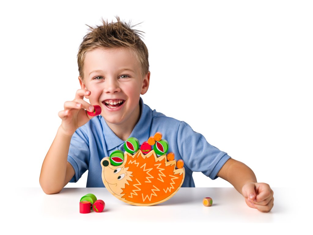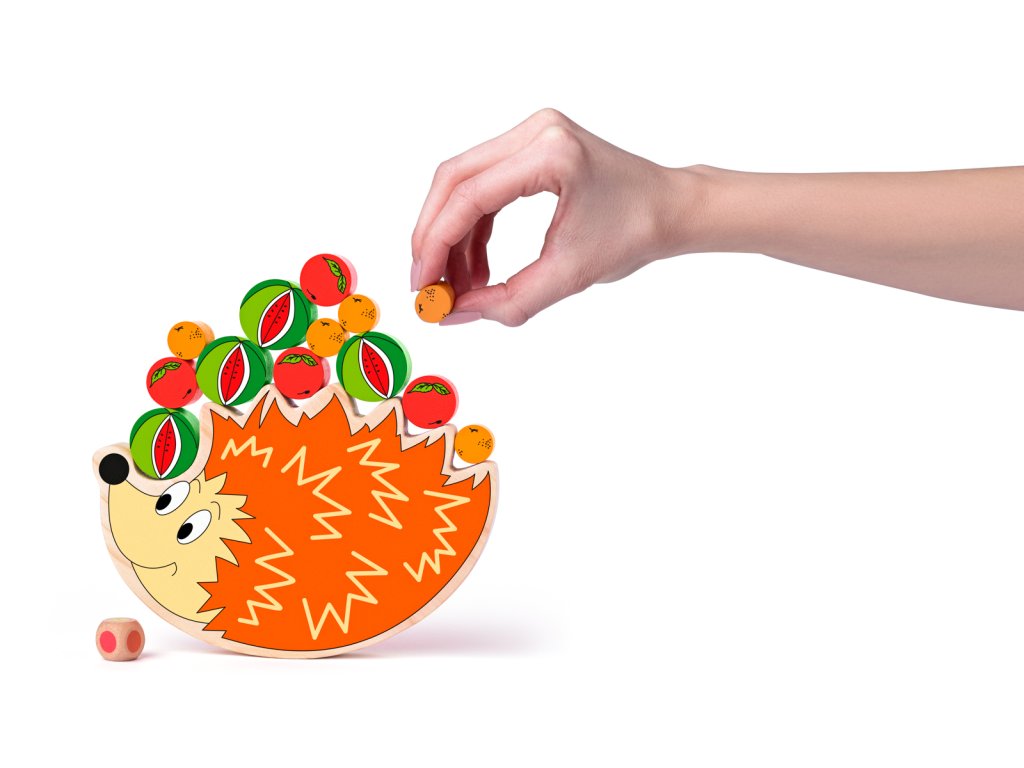 Hra a didaktická pomůcka v jednom. Hráči hází kostkou, na jejíž stranách jsou barevné puntíky, jejíž barva hráči napoví, které ovoce bude na ježka pokládat. Úkolem hráče je položit na ježka ovoce tak, aby se ježek nepřevážil a ovoce ze svého hřbetu nevysypal. | Věk: 3+| Rozměr: 17 x 11 cm