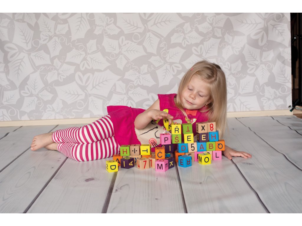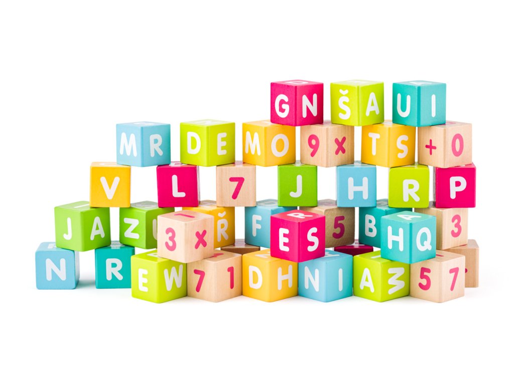 Věk: 3+ | Tyto různobarevné kostky mají na sobě písmena a číslice a hodí se nejen k učení prvních slov, ale i ke stavění hradů a domečků. Velikost kostičky: 3,5cm