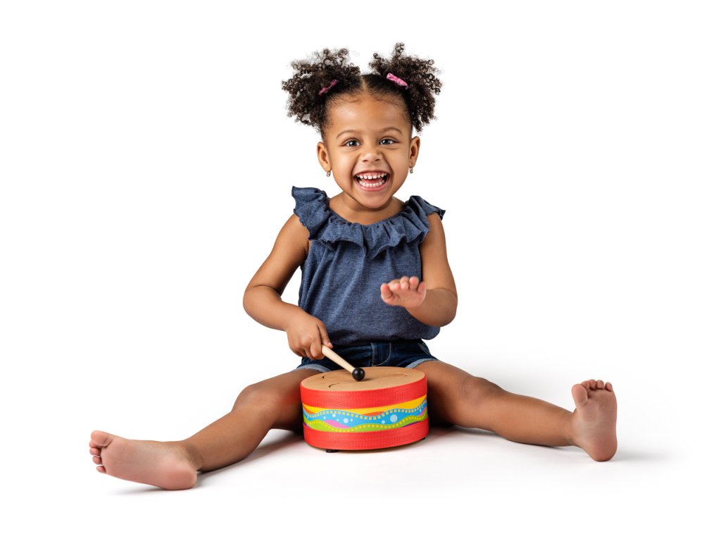 Bubnovací plocha dřevěného bubínku je spirálovým průřezem rozdělena na několik částí. Každá z těchto částí má jiný tón úderu. Tóny bubnu jsou ovlivněny materiálem, z kterého je buben vyroben a mají příjemně dřevitý podtón. Vizuální provedení bubínku navozuje hravou atmosféru plnou radosti a fantazie. Věk: 3+ | Průměr bubínku: 15 cm, výška: 9 cm