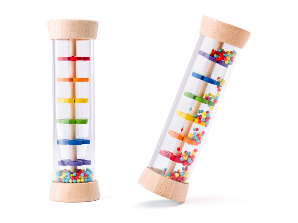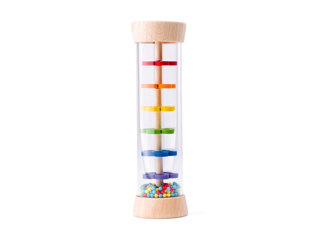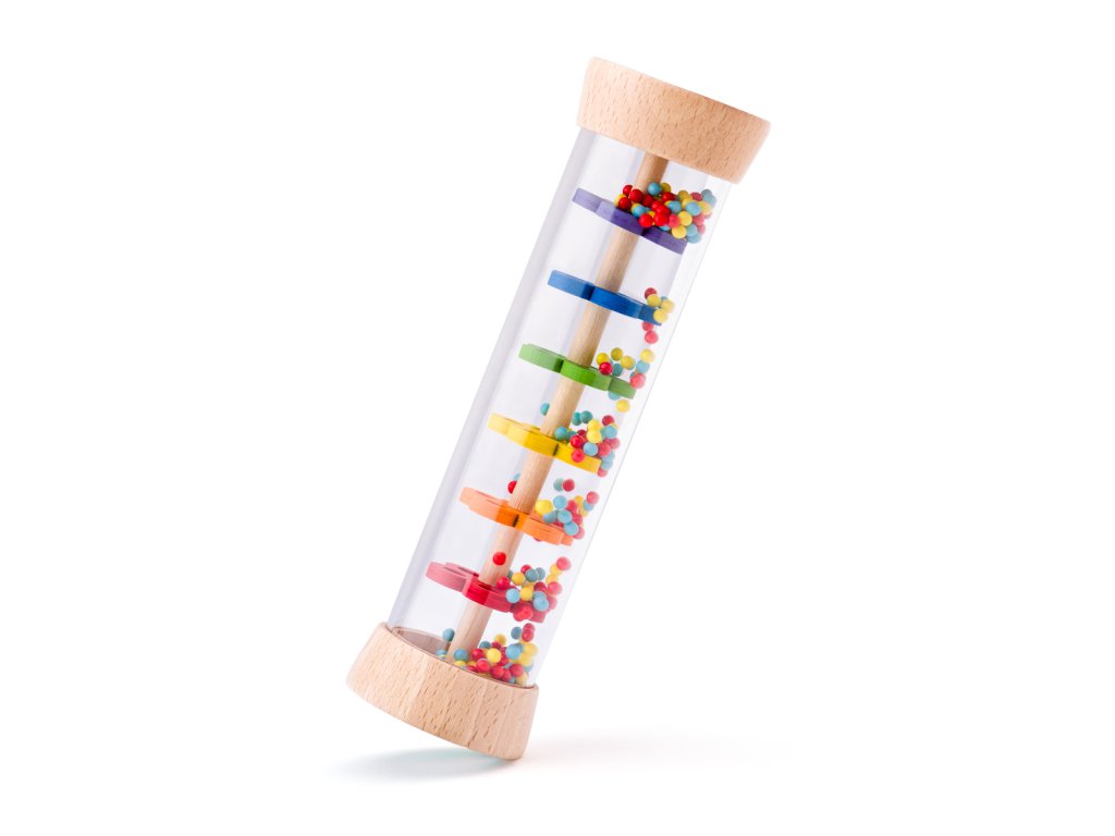 Překlápěním válce propadají duhové korálky skrz kaskádu překážek. Chrastí a vytváří pro dítě zábavnou podívanou.| Věk: 1+| Rozměr: průměr 5,5 x 19 cm.