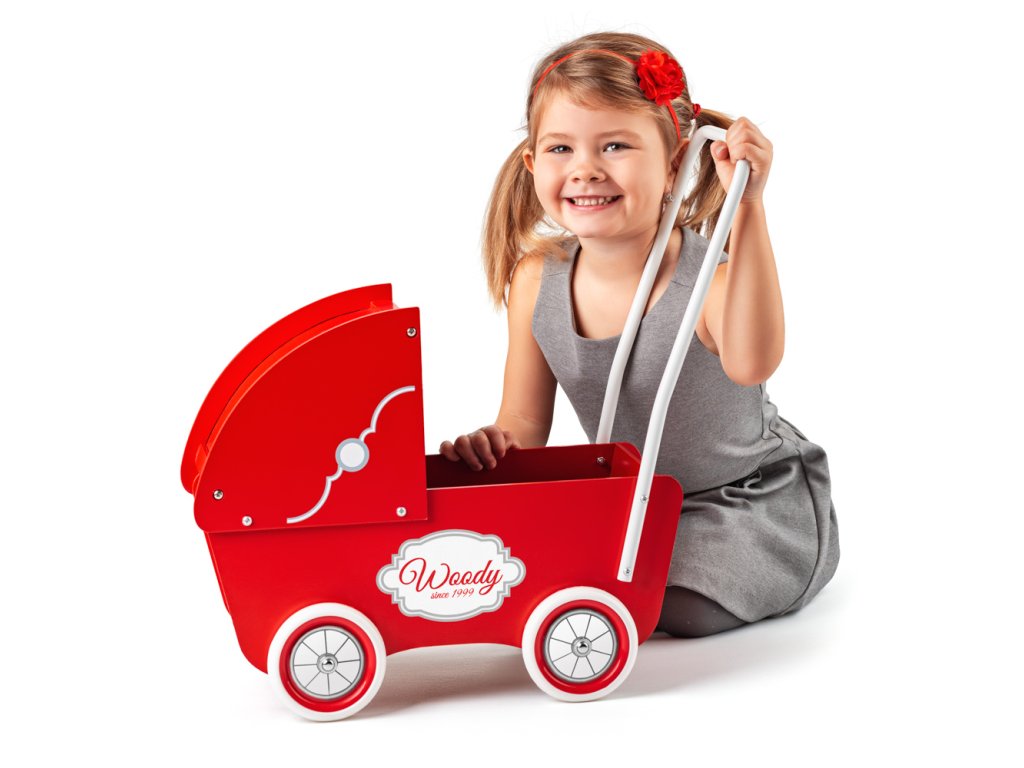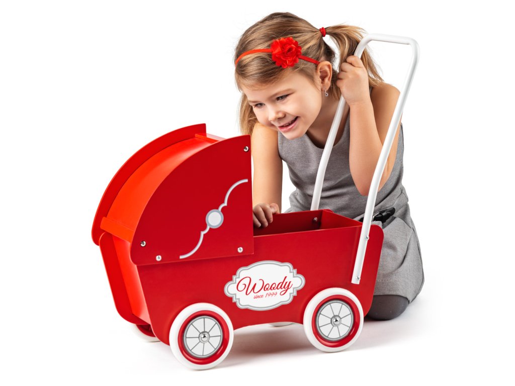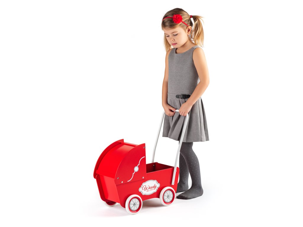 Dřevěný kočárek v retro designu pro nejmenší holčičky má vysokou rukojeť, gumová kolečka a hlubokou korbu, do které se bezpečně vejde jedna ležící panenka do 40 cm nebo cokoliv dalšího, co potřebuje malé dítě převézt-| Věk: 3+ | Rozměr: 40,5 x 21,5 x 46,5 cm