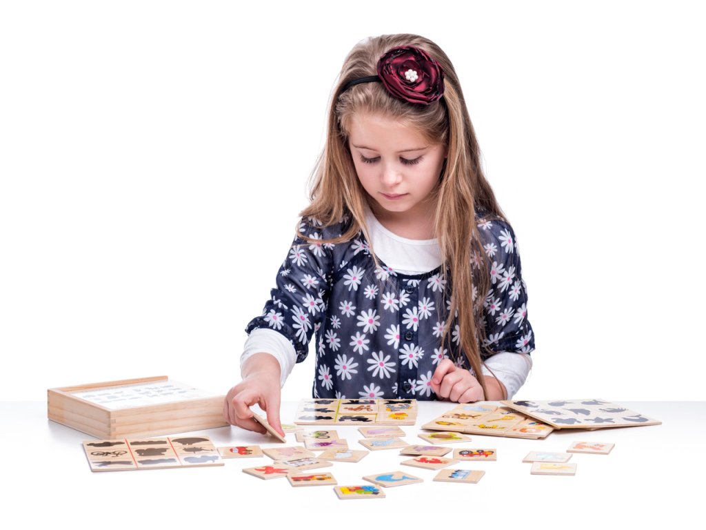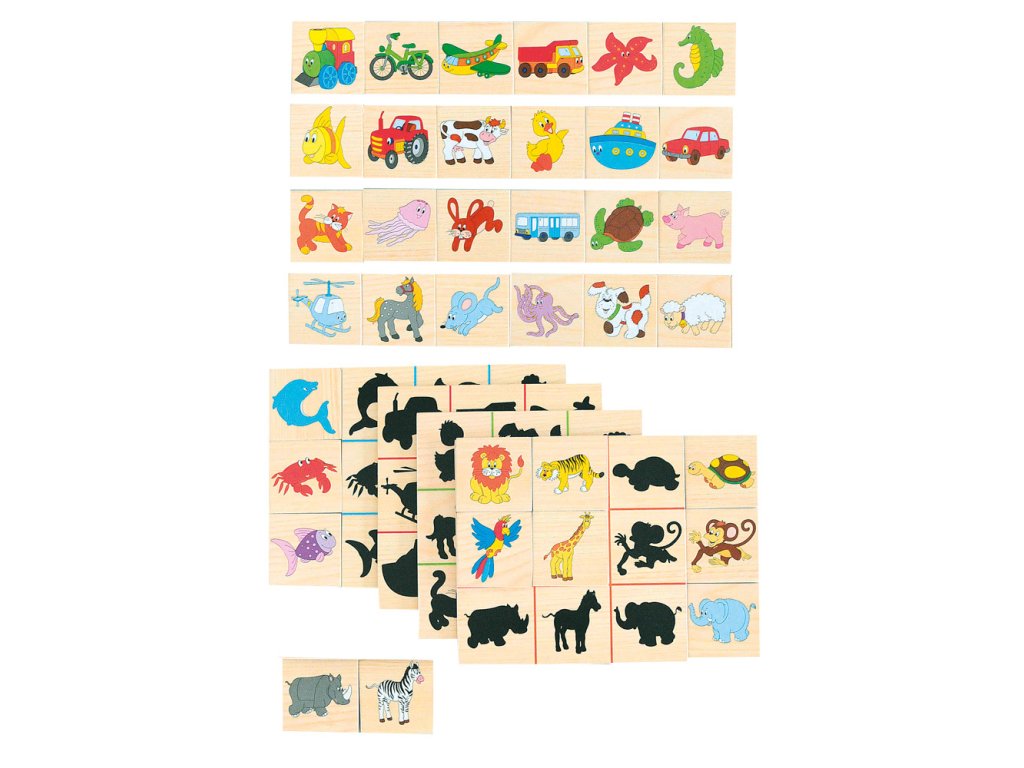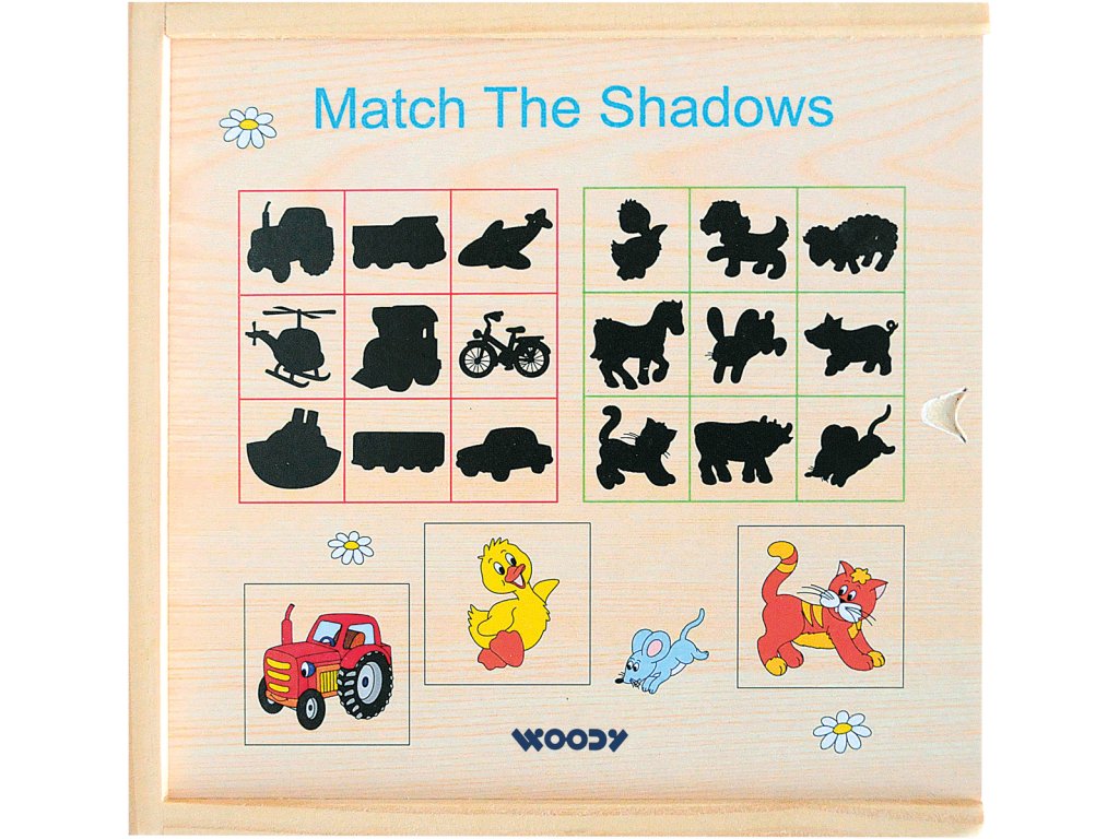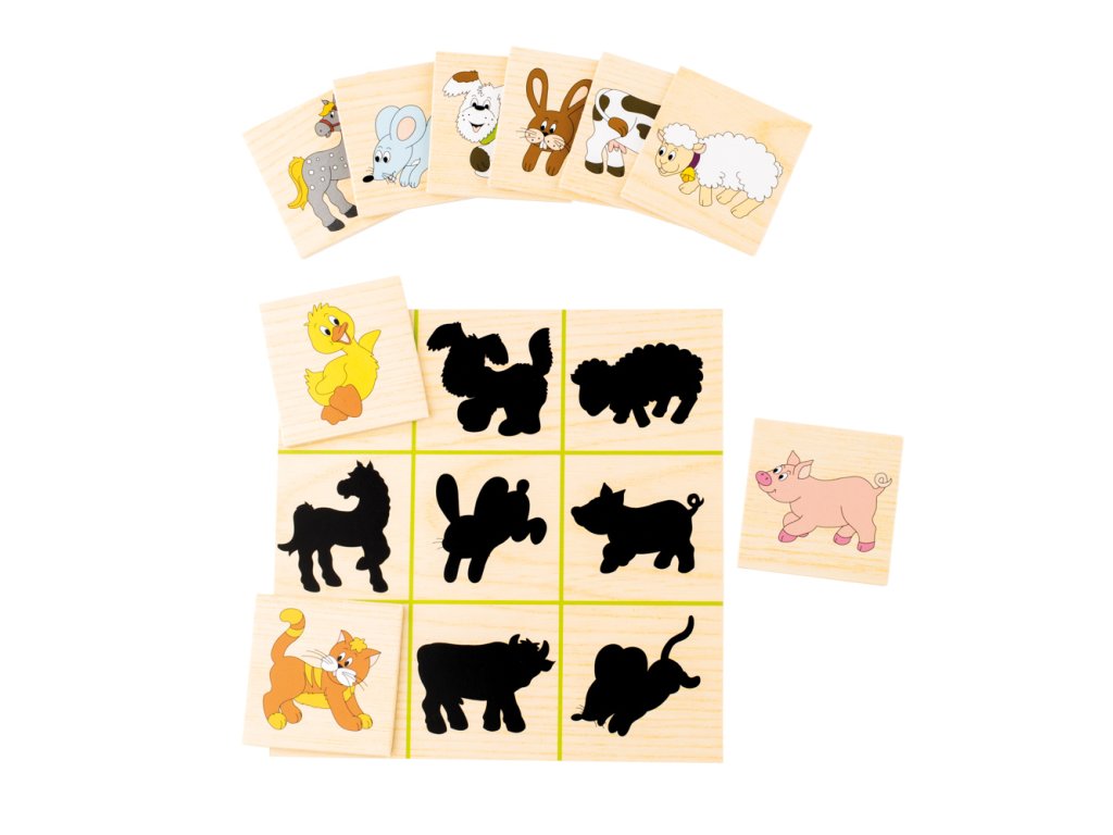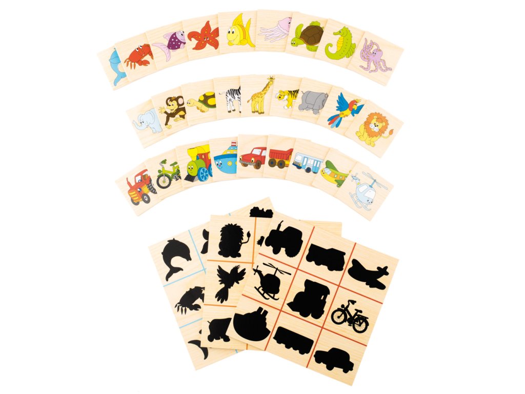 Dítě přiřazuje destičky s barevnými obrázky k jejich černým siluetám. Vše je zabaleno v praktické dřevěné krabičce.