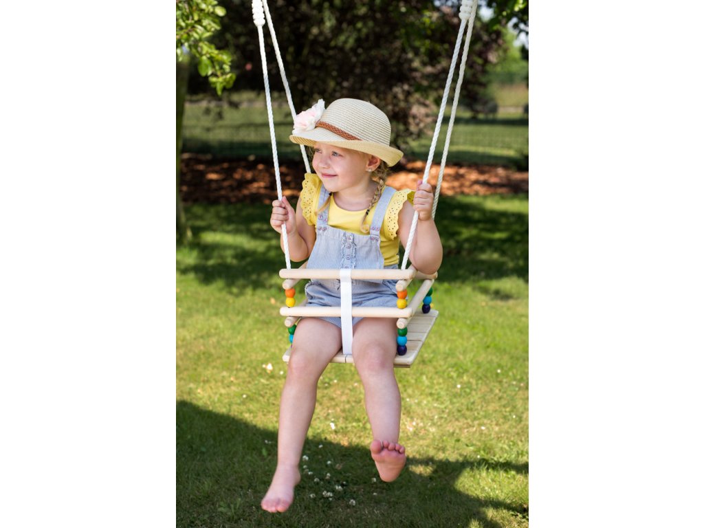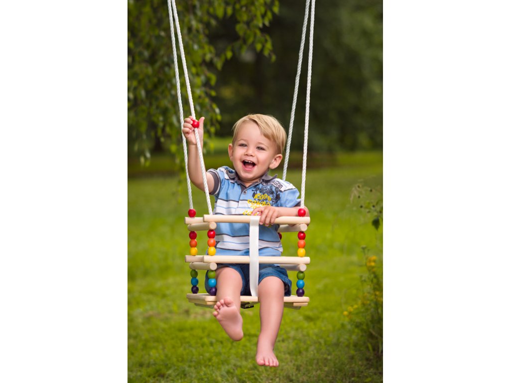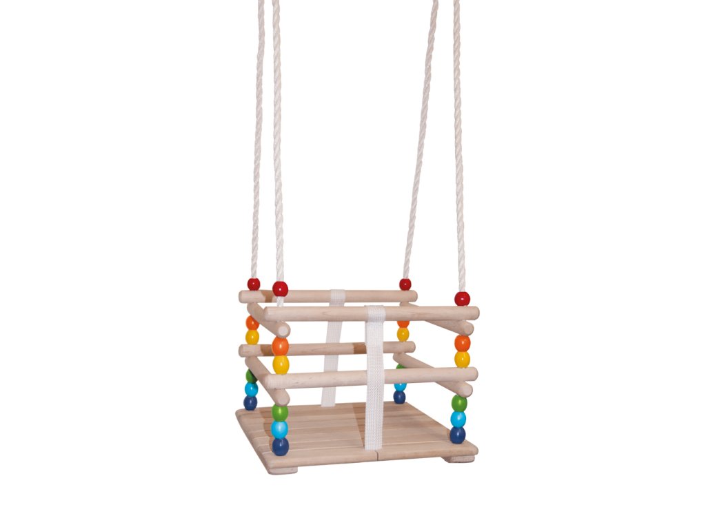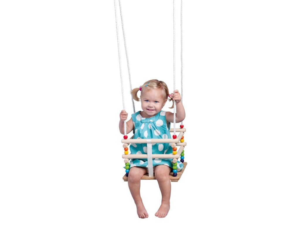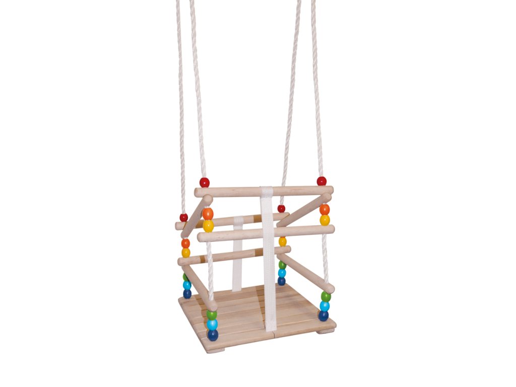 Houpačka pro nejmenší děti je vyrobena z masivního dřeva. Je opatřena bezpečnostní ohrádkou a popruhem umístěným mezi nohami dítěte, který zabraňuje vyklouznutí dítěte z houpačky. Houpačka má nastavitelnou délku lan. Je vhodná do interiéru i exteriéru. Je určena pro zavěšení na bezpečnostní (nejlépe točivé) háky, které však nejsou součástí balení. Vyrovná se uvolněním šňůry.