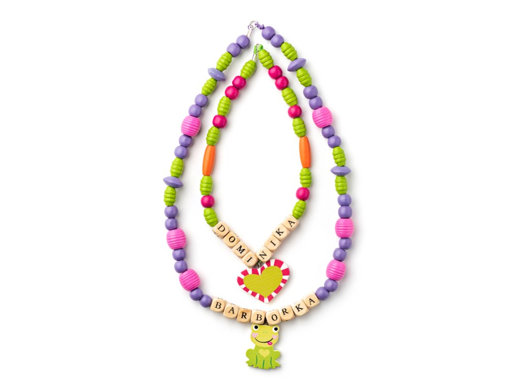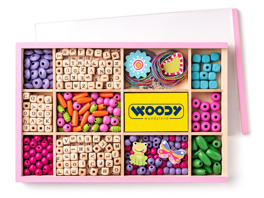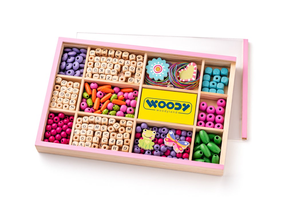 Sada obsahuje: barevné korálky různých tvarů, korálky s motivem ABC, květin, srdíček, zvířátek a šňůrky k navlékání se zapínáním. Vše umístěno v praktické dřevěné krabičce se zasouvacím víkem z plexiskla. Rozměr: 29 x 19,2 x 3 cm. Věk: 3+