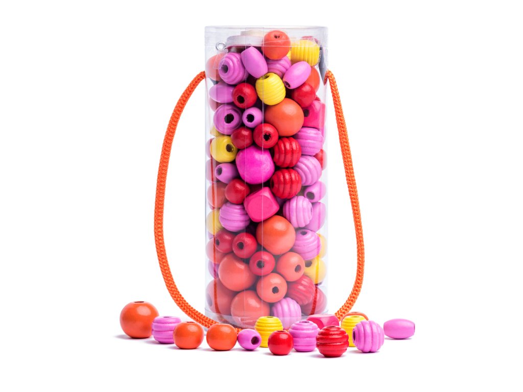 Tuba obsahuje velké množství klasických i soustružených korálků, korálků ve tvaru kytiček a tenké tkanice s koncovkou k provlékání. Vhodné pro rozvoj jemné motoriky. Praktické uzavíratelné balení na cesty. | Věk: 3+ | Rozměr: 6 x 15,5 cm |