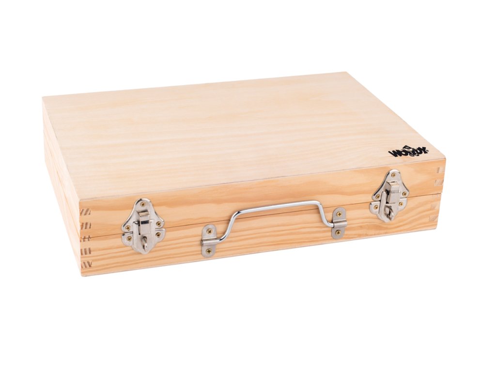 Kovové nářadí je reálnou kopií skutečného nářadí pro dospělé. Praktický dřevěný kufřík s panty, v němž je nářadí umístěno, je opatřen dvěma kovovými přeskami a kovovým uhem pro možnost přenášení. Uvnitř kufříku jsou instalovány západky a speciální otvory, které zajistí jednotlivé kusy nářadí tak, aby při manipulaci nevypadly. Sada obsahuje 16 ks nářadí. Věk: 5+ | Rozměr otevřeného kufříku: 45 x 3,5 x 32 cm