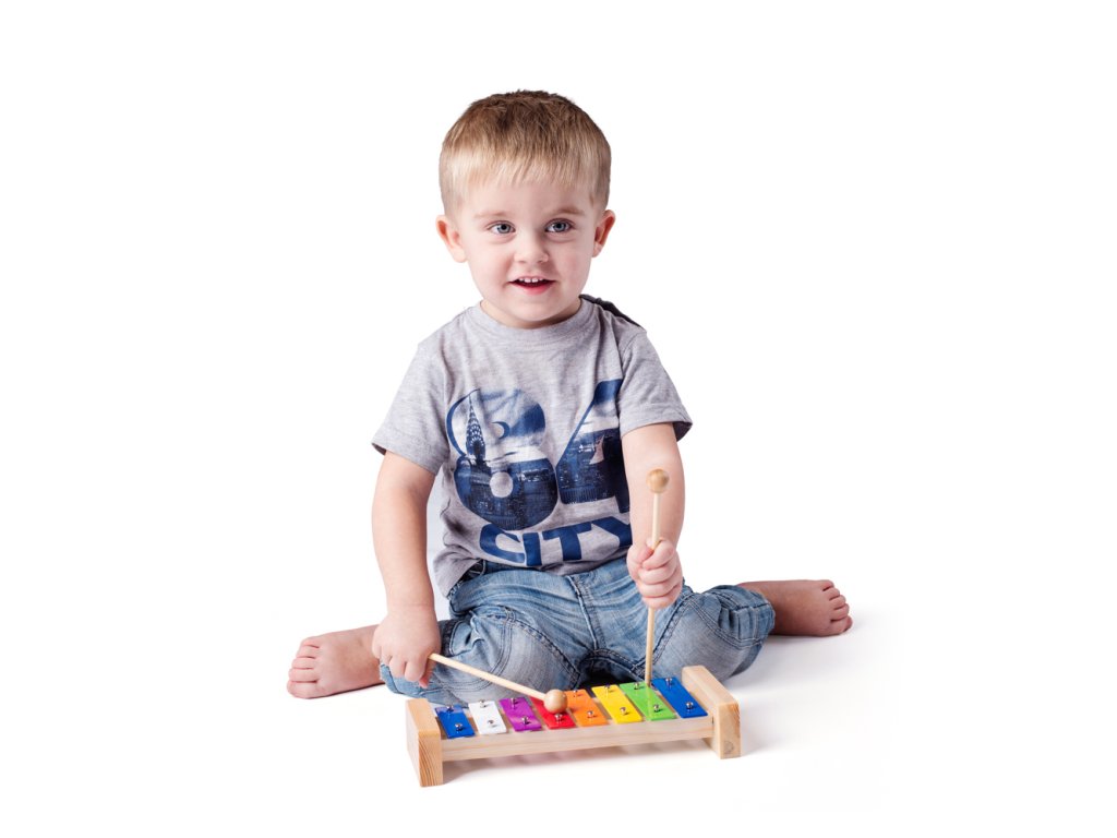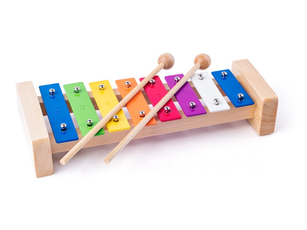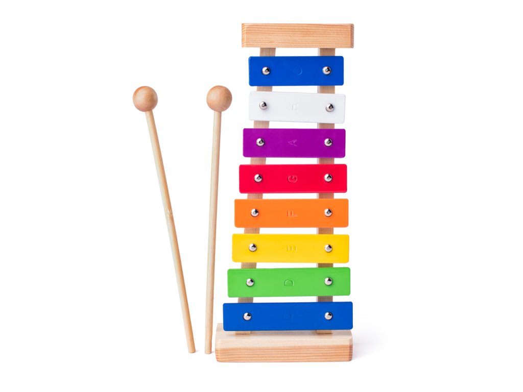Xylofon patří mezi bicí nástroje. Jeho kovové plátky jsou usazeny na filcových kroužcích, které regulují ostrost zvuku. Dřevěný rám i paličky propůjčují zvuku hloubku a sametovový tón. Věk: 3+ | Rozměr: 25,5 cm