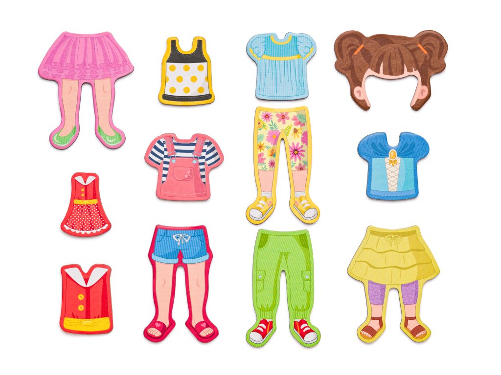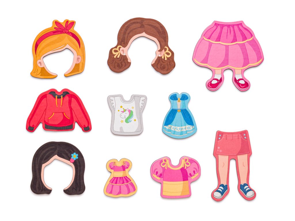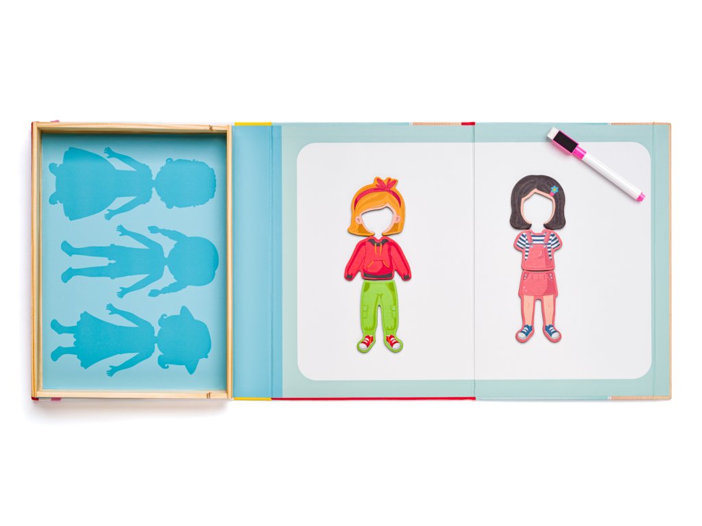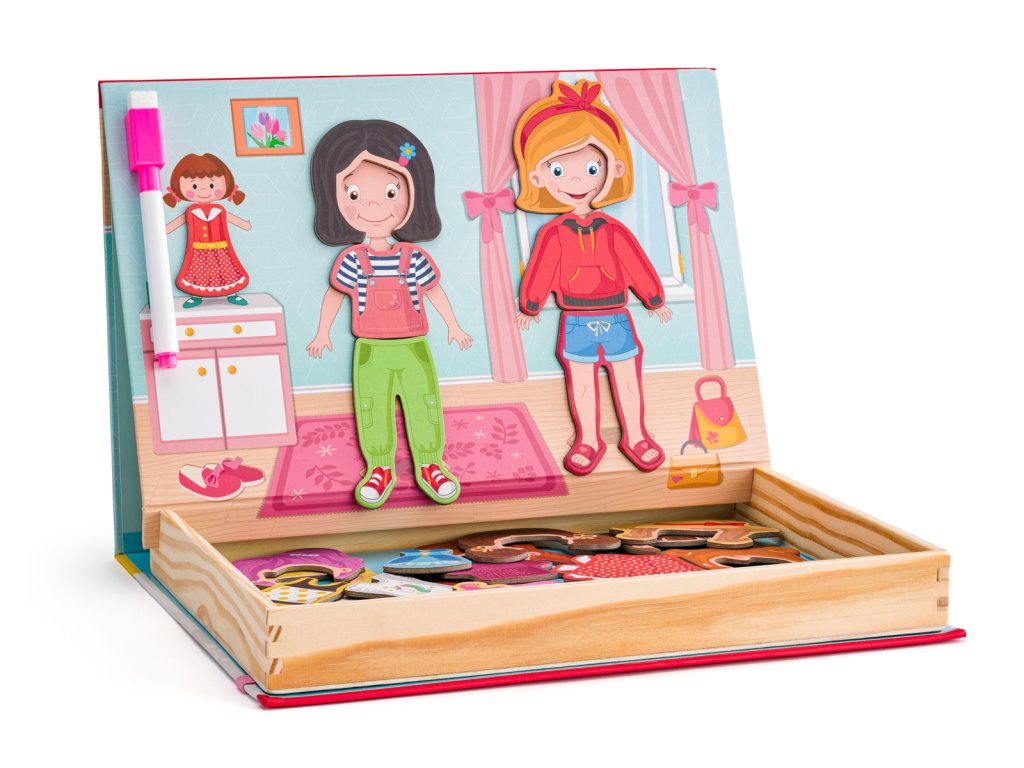 Stylová zábava pro malé módní návrhářky! Otevři dřevěnou krabičkou plnou magnetických oblečků a vytvoř dokonalé outfity pro dvě holčičky na magnetickém víku. Kombinuj trička, sukně, kalhoty, šaty i účesy – a nezapomeň obléct i jejich panenku! Inspiruj se přiloženými kartičkami s modními tipy. Věk: 3+| Rozměr: 27 x 20 x 4 cm | Počet ks: 39