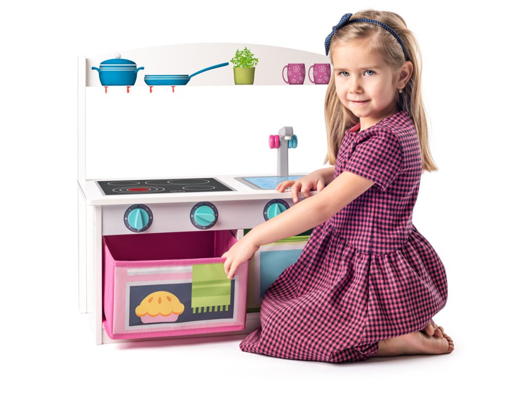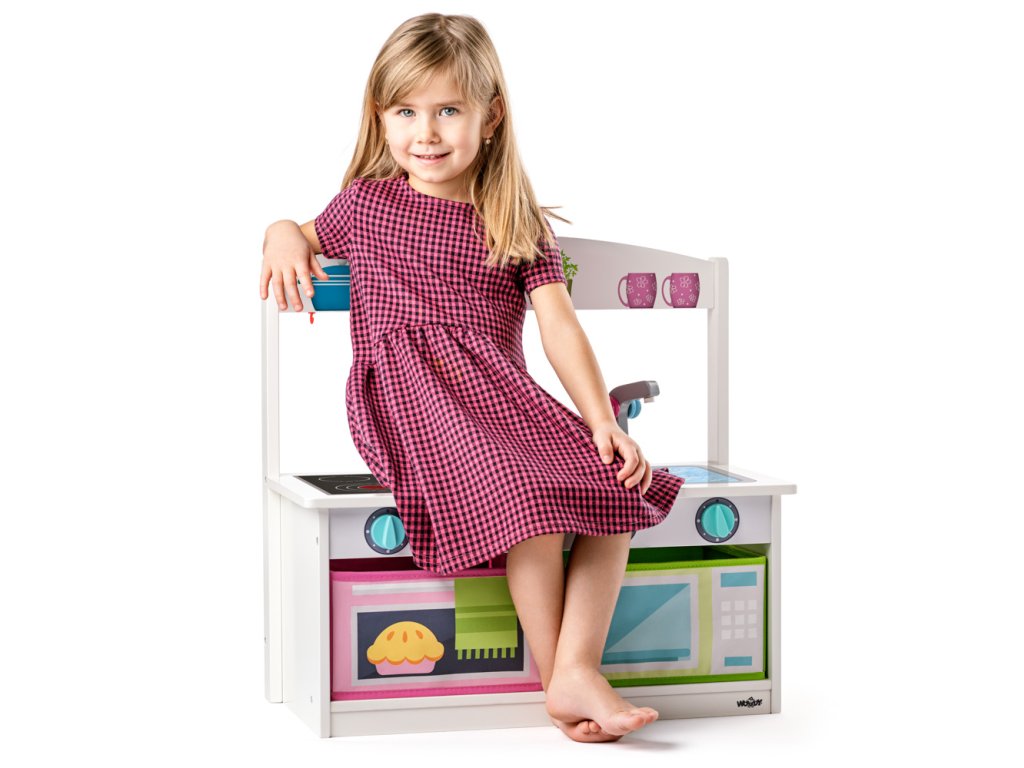 Lavice s úložným prostorem pro hračky je zároveň i kuchyňkou s otočnými knoflíky a vodovodní baterií, která se upevní na vrchní desku pomocí magnetu. Obsahuje: 3 dílky. Rozměr: 59 x 31,5 x 58 cm. Výška pracovní desky: 28,5 cm. Věk: 3+