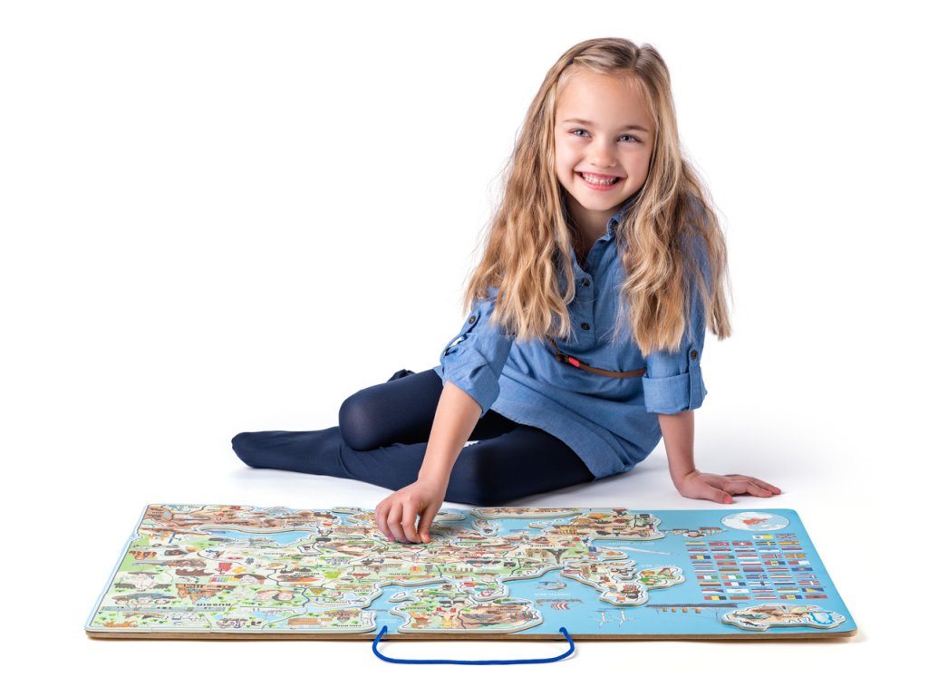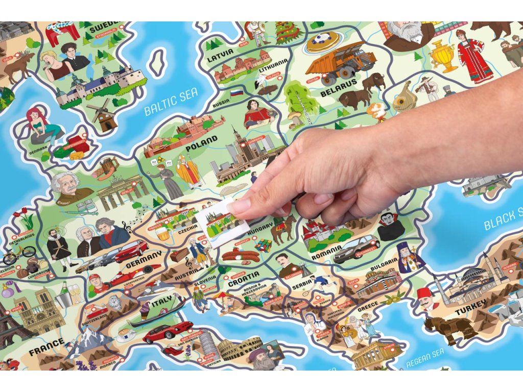 Naučné puzzle, školní pomůcka a společenská hra v jednom! Cílem je naučit dítě vnímat Evropu jako celek plný zajímavostí. Dítě pokládá dílky znázorňující jednotlivé státy nebo jejich části na magnetickou plochu. Učí se tak poznat, kam jednotlivé dílky patří. Později už bezpečně ví a osvojí si znalost, kde a na jaké části „starého kontinentu“ se jednotlivé země nacházejí. Díky obrázkům umístěným na každém dílku si děti ihned uvědomí, co je pro každou zemi charakteristické, co se kde pěstuje, vyrábí, těží, kde jaká zvířata žijí, event., kde se jaká stavba, budova, hrad či zámek nachází. S kompletně poskládanou mapou si pak s rodiči nebo kamarády zahrají hru, která bystří smysly a trénuje postřeh. Design a kresby pocházejí od českých designerů. Obsahuje: 192 dílků. Rozměr: 75 x 45 x 0,5 cm. Věk: 4+