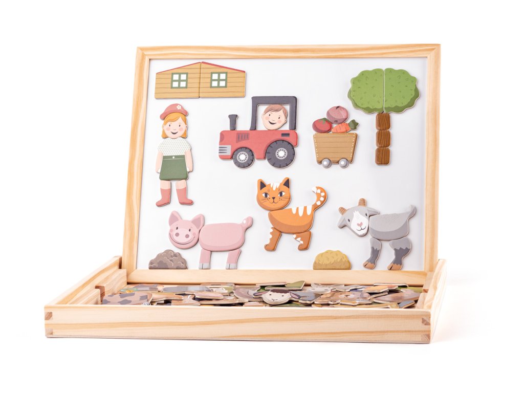Magnetická dřevěná skládanka na téma zvířátka a lidé. Obsahuje množství dílků (hlavičky, tělíčka, nožky, části staveb, rostlin…) z kterých děti dokážou vytvořit nekonečné variace obrázků plných fantazie. Z dílků mohou vytvořit správná i zvíře-nezvíře s hlavou krávy, tělem psa a nohami kohouta. Skládačka podporuje představivost, rozvoj jemné motoriky. Rozměr desky: 33 x 25 x 3,2cm. Rozměr balení: 33,5 x 3,5 x 27 cm. Věk: 3+