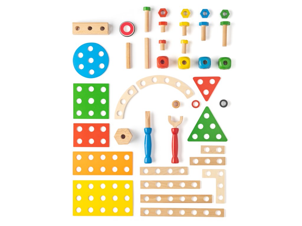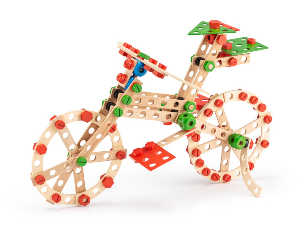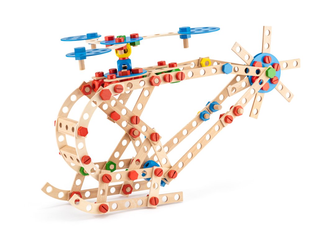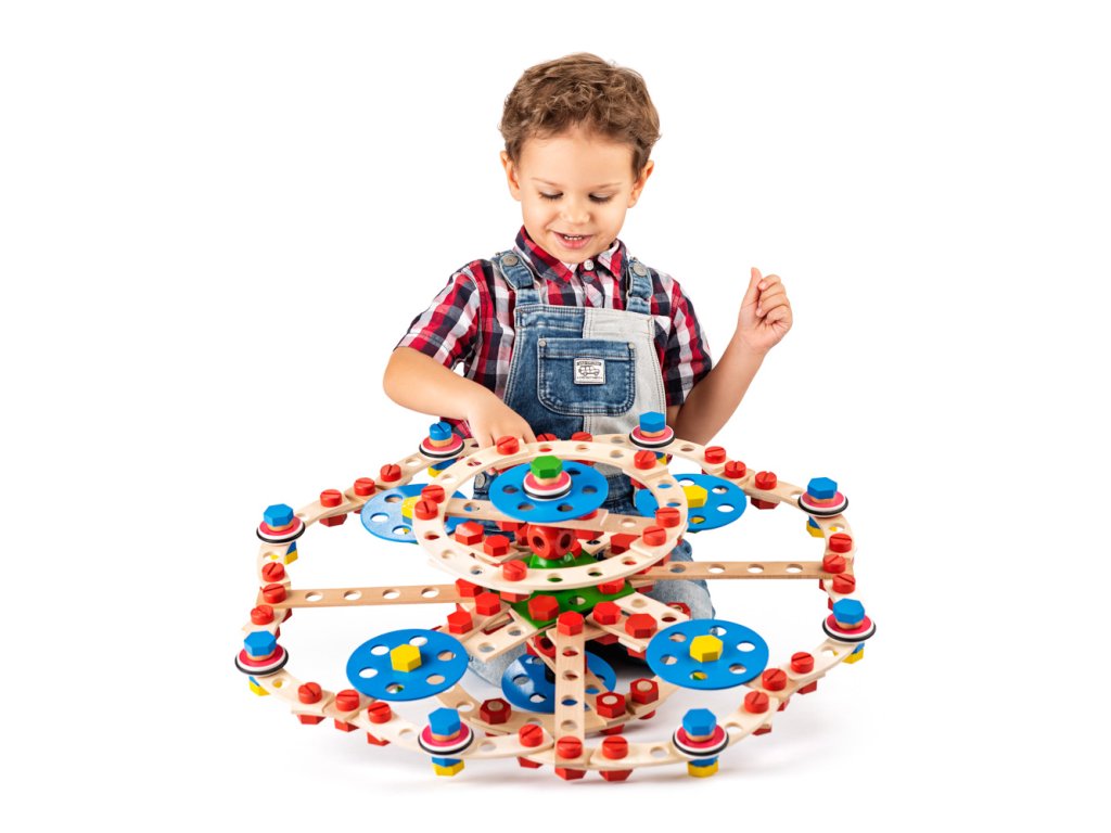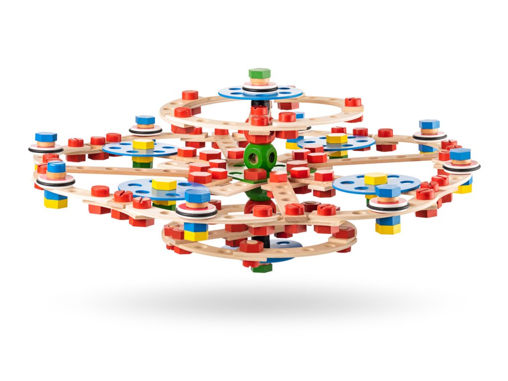 Montážní stavebnice ´´Engeneer´´ nabízí dětem konstrukční hru s nekonečným množstvím variant různých staveb od strojů a dopravních prostředků přes domečky , jeřáby až po létající talíře, mosty, věže atd. Obsahuje obrovské množství vysoce kvalitních dřevěných dílů ( dřevěné destičky v různých tvarech, matice, šrouby, kolečka, podložky, šroubovák a montážní klíč, atd...), se kterými se snadno pracuje a které po zatažení šroubů vytvoří pevnou konstrukci. Věk: 3+. Velikost dílku se 6ti dírkami: 22 cm, velikost obdélníkové destičky: 18,5 x 11 cm. Počet ks: 340