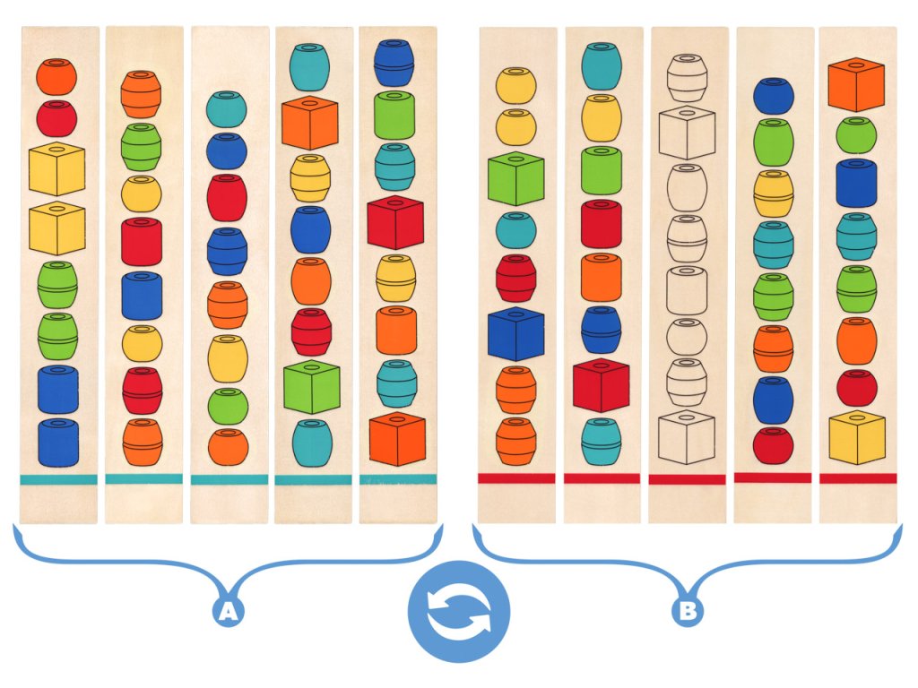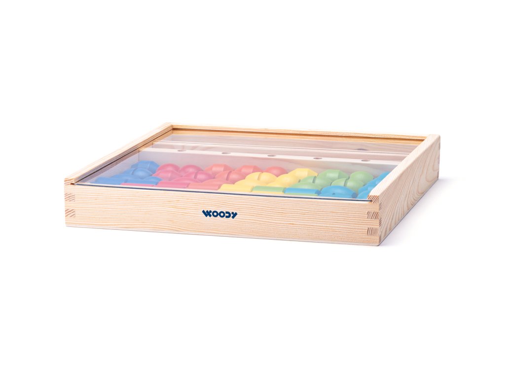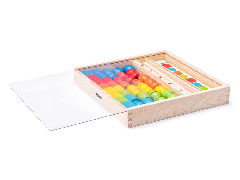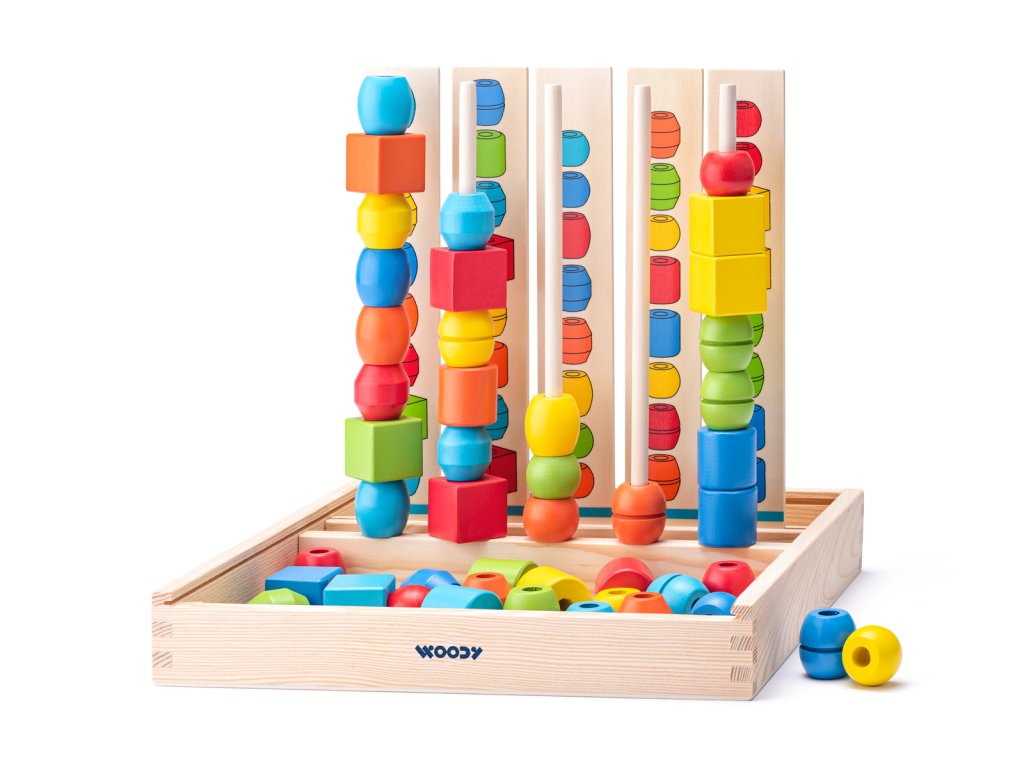 Věk: 3+ | Rozměr: 32 x 33 x 5cm | | Navlékání dřevěných korálků na tyčky podle předloh. | Dítě dle předlohy nakreslené na dřevěných destičkách navléká na tyčku barevné korále, tak aby odpovídaly předloze. Motoricko-didaktická hra, která nenásilnou formou učí děti rozeznávat základní barvy a tvary.