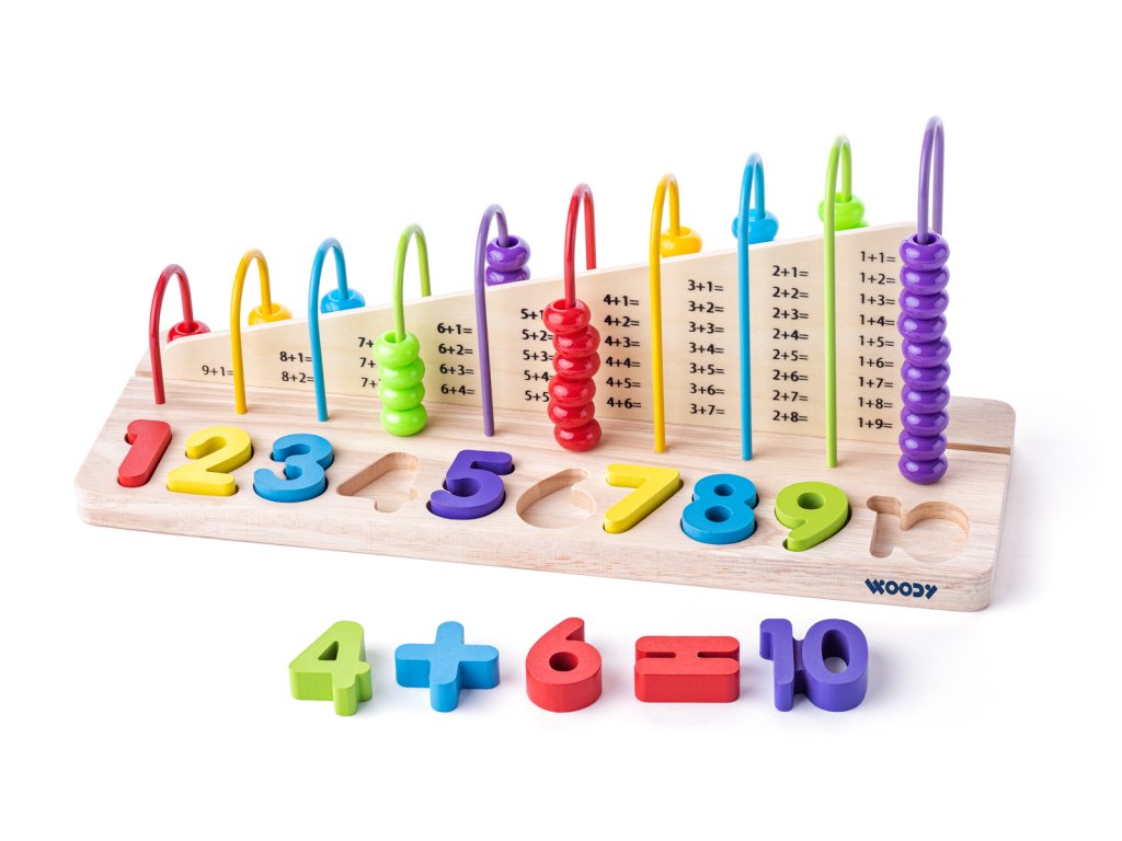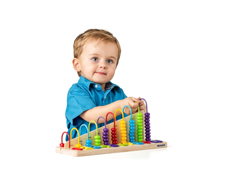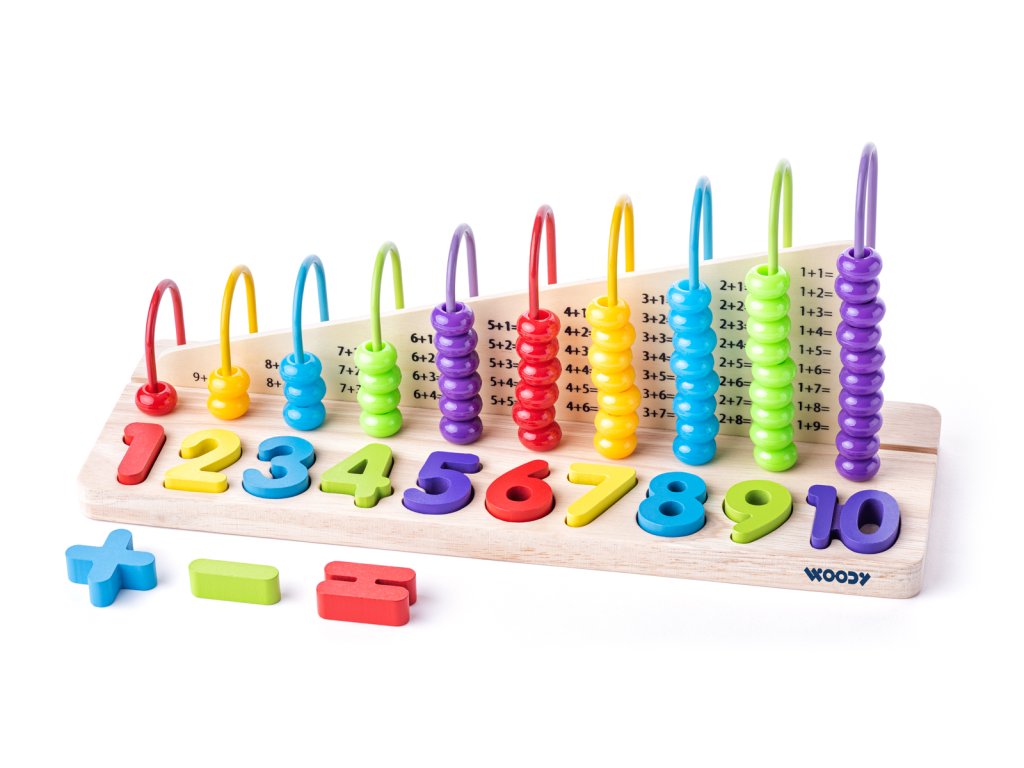 Na každé drátěné konstrukci počítadla je přesně tolik korálků, kolik znázorňuje číslice pod ním. Dítě tak může trénovat jednotlivé matematické úlohy, které vidí napsané na střední dělící příčce. Počet dílků: 13. Rozměr: 34 x 11,5 x 15,2 cm. Rozměr balení: 34,5 x 12 x 16,5 cm. Věk: 3+