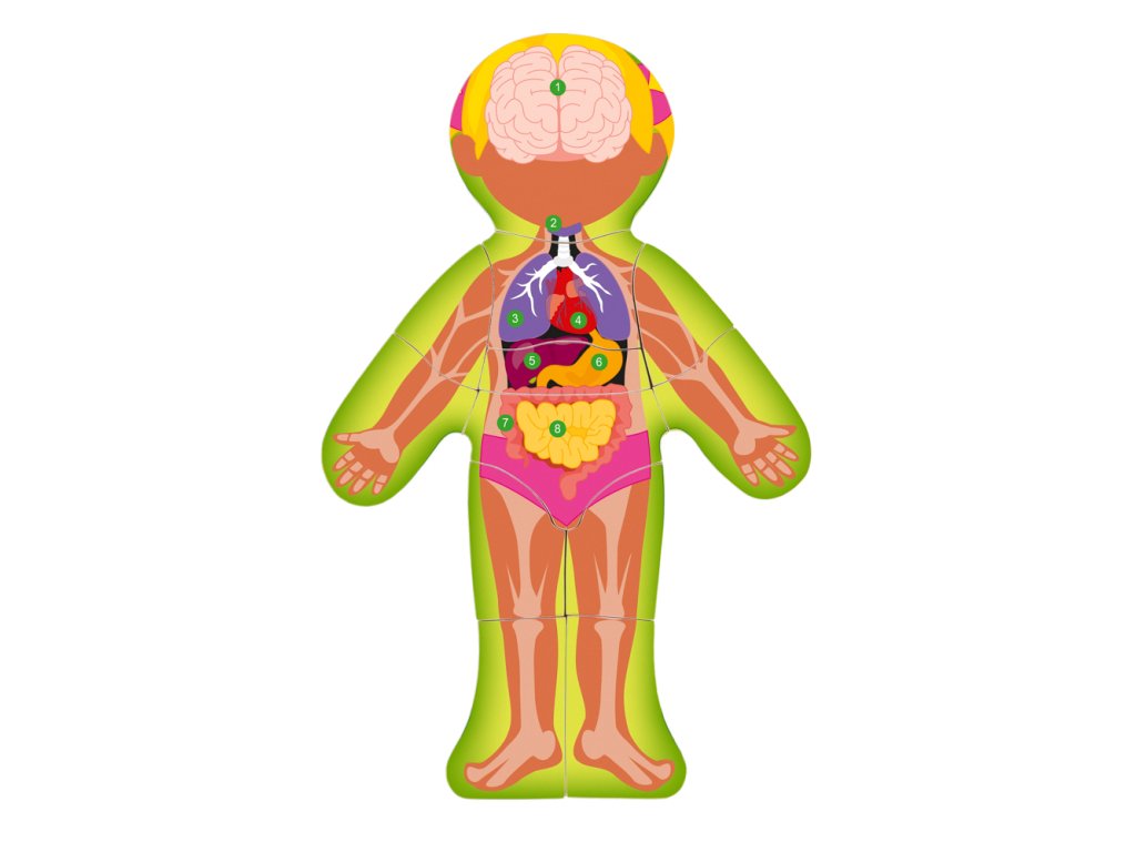 Anatomie lidského těla pro nejmenší. Po otočení lícové části puzzle (kůže), vidí dítě na rubu orgány a pod nimi kosti, které se na tomto místě skrývají. Vše je opatřeno popisky a základními názvy v češtině. Rozměr: 22,5 x 30 x 0,8 cm | Balení obsahuje 13ks | Věk: 3+