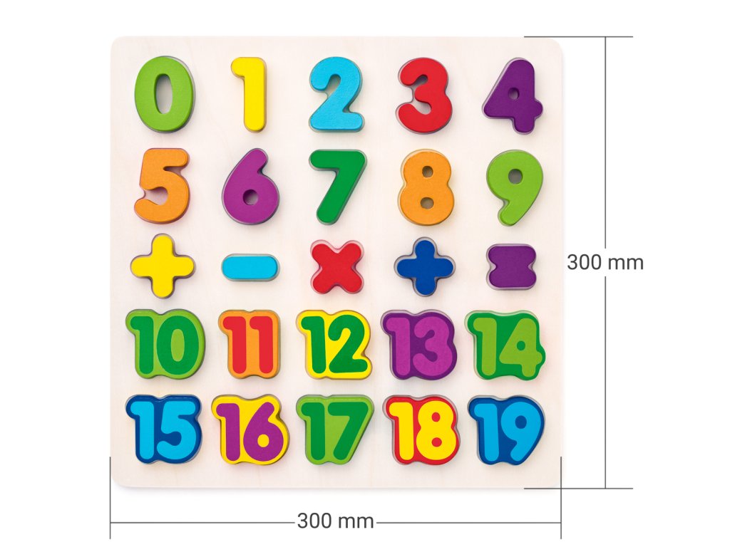 Dítě vkládá číslice do správných výseků. Může skládat a procvičovat i jednoduché matematické příklady. Vhodné pro předškoláky. Obsahuje: 25 dílků. Rozměr: 30 x 30 x 1,8 cm. Rozměr balení: 30 x 30 x 1,8 cm. Věk: 3+