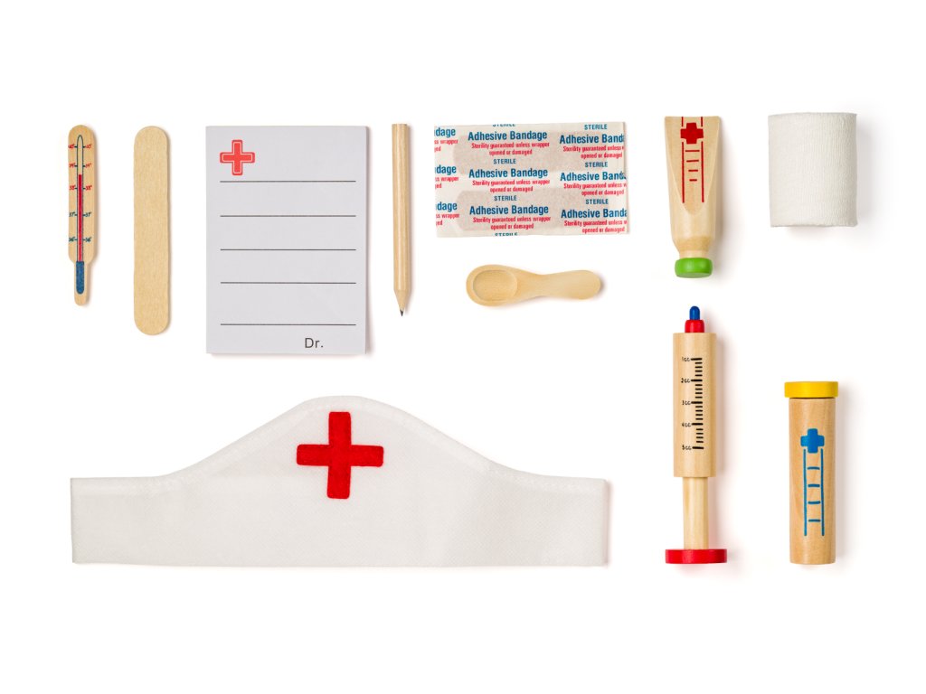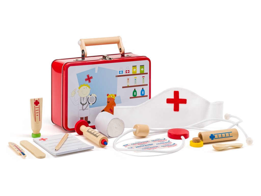 Uvnitř najdeš vše, co potřebuješ, aby ses mohl/a proměnit v opravdového doktora/ku. Vše si pak můžeš uložit zpět do praktického plechového kufříku. Obsah kufříku : doktorská čepička-1x fonendoskop 1x injekce 1x teploměr -1x obvaz - 1x tuba krému (dřevěná replika) - 1x tuba na léky - 1x lžička - 1x tužka - 1x špachtle - 1x