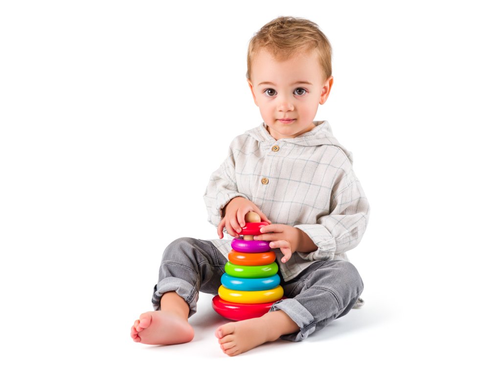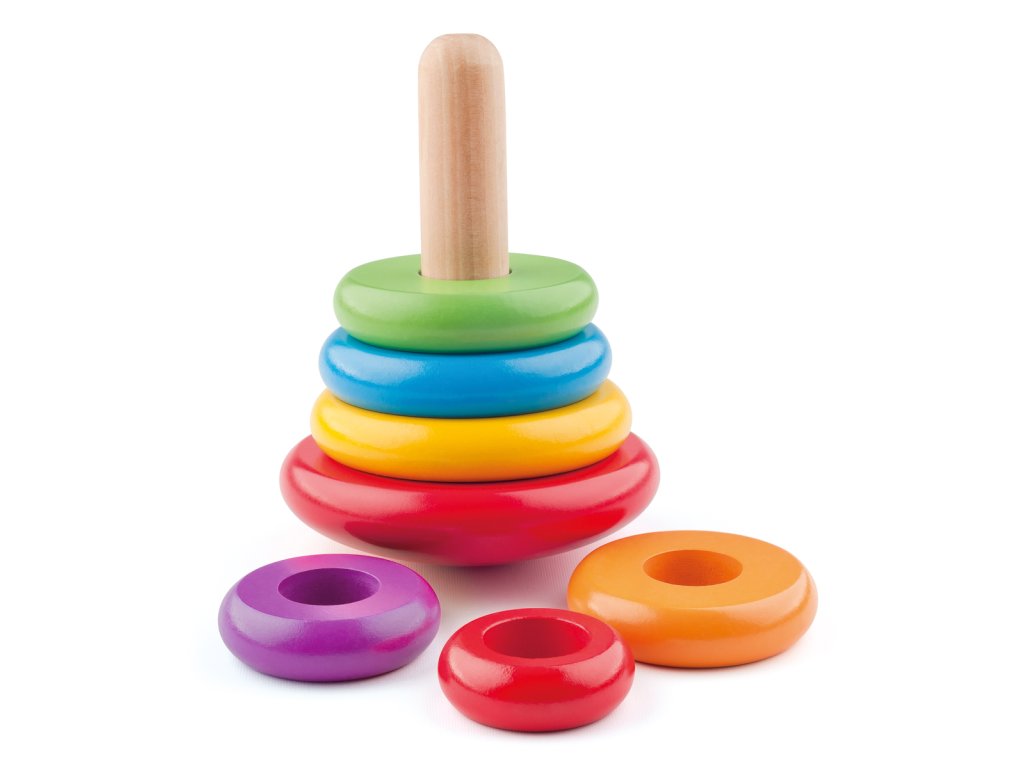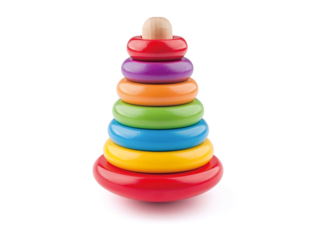 Skládací pyramida a Káča v jednom. Různobarevné dřevěné kroužky se navlékají na tyčku od nějvětšího k nejmenšímu. Úkolem této hračky je rozvoj dětské motoriky. Navíc lze roztočit jako Káča. Věk: 18m+ Rozměr: 13 x 13 x 17cm