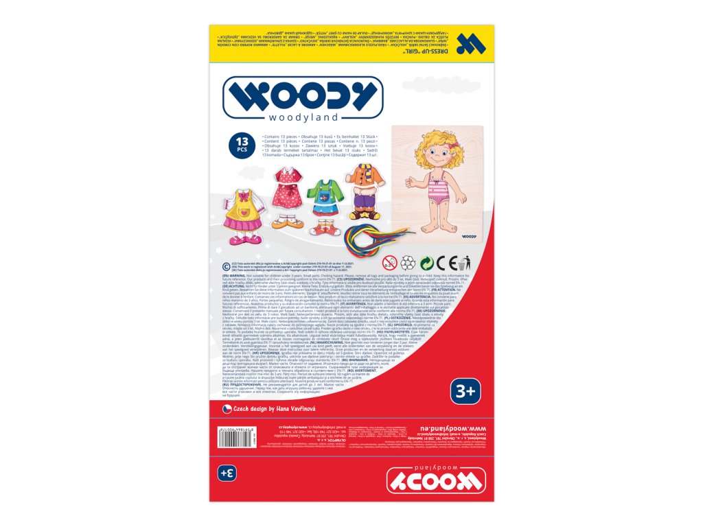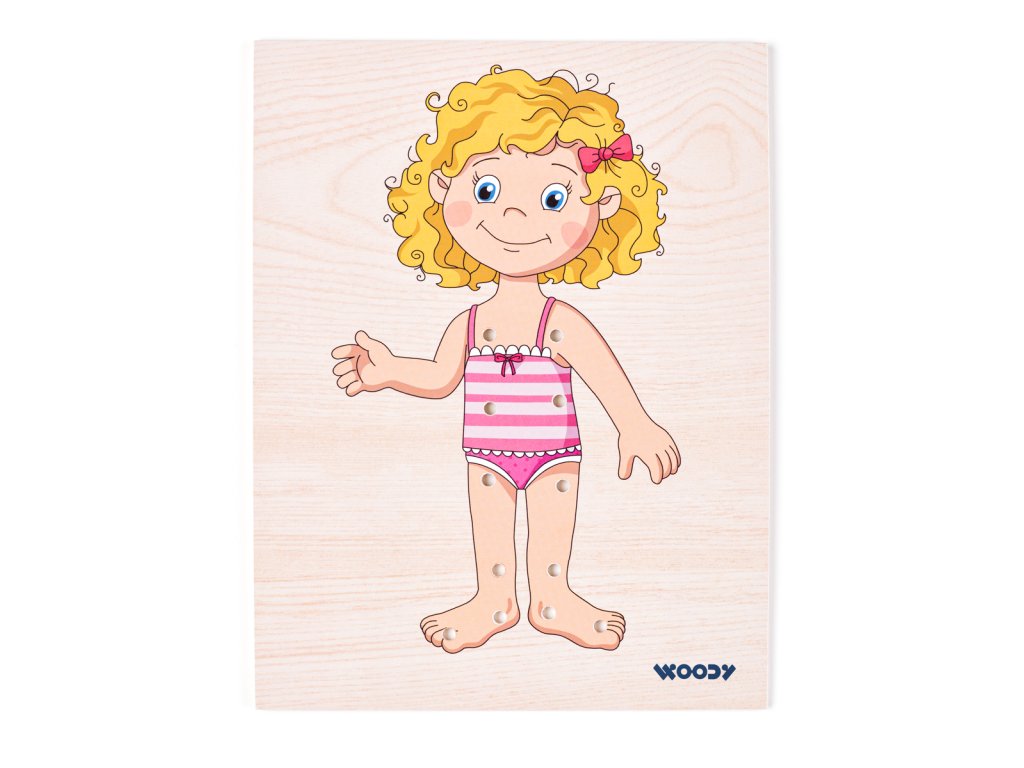 Děti mají možnost si dle vlastní fantazie oblékat a měnit postavičku holčičky. Tato hračka rozvijí schopnost logického myšlení a vývoj fantazie. Holčička je namalovaná na vysouvacím víku od krabičky a na těle má 14 dírek, které umožňují přichycení vybraného oblečku tkaničkami. K dispozici jsou 4 druhy oblečků, ve kterých jsou také vyvrtané dírky tak, aby se daly provlékat tkaničkami a spojovat s obrázkem holčičky. Součástí balení jsou i 4 barevné tkaničky na ´´šití´´. Určeno pro děti starší 3 let. Rozměr krabičky: 18,5 x 23 x 2,5 cm