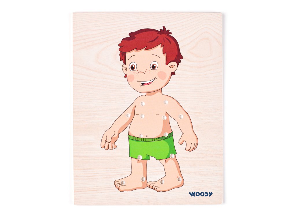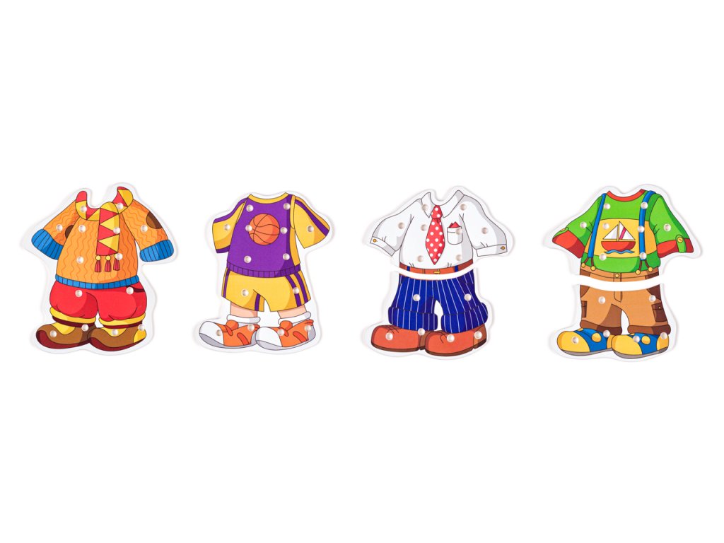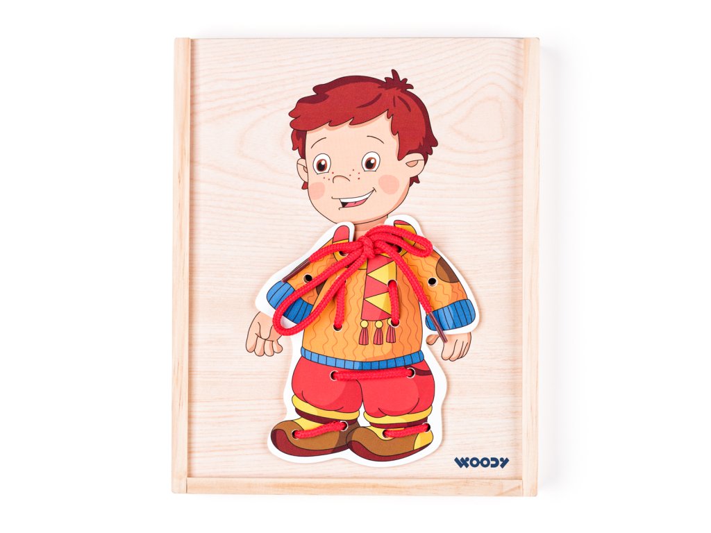 Děti mají možnost si dle vlastní fantazie oblékat a měnit postavičku chlapečka. Tato hračka rozvijí schopnost logického myšlení a vývoj fantazie. Chlapeček je namalovaný na vysouvacím víku od krabičky a na těle má 14 dírek, které umožňují přichycení vybraného oblečku tkaničkami. K dispozici jsou 4 druhy oblečků, ve kterých jsou také vyvrtané dírky tak, aby se daly provlékat tkaničkami a spojovat s obrázkem chlapečka. Součástí balení jsou i 4 barevné tkaničky na ´´šití´´. Určeno pro děti starší 3 let. Rozměr : 18,5 x 22 x 2,5 cm
