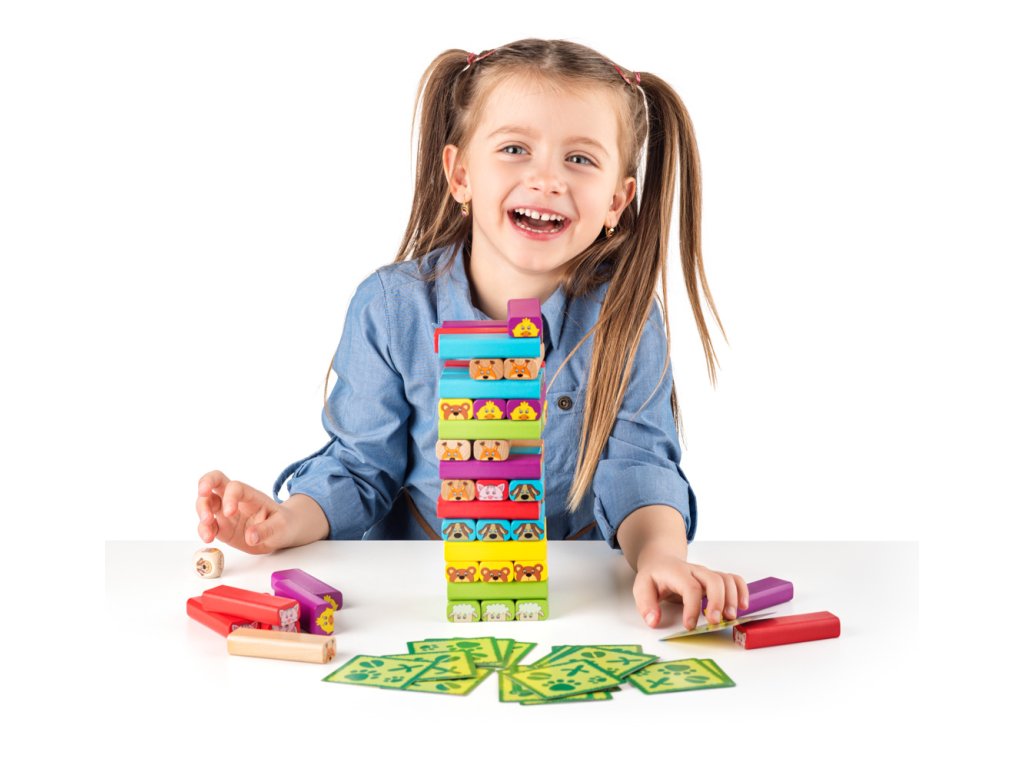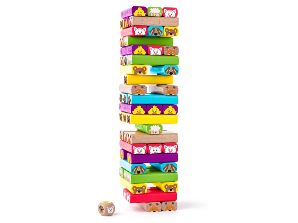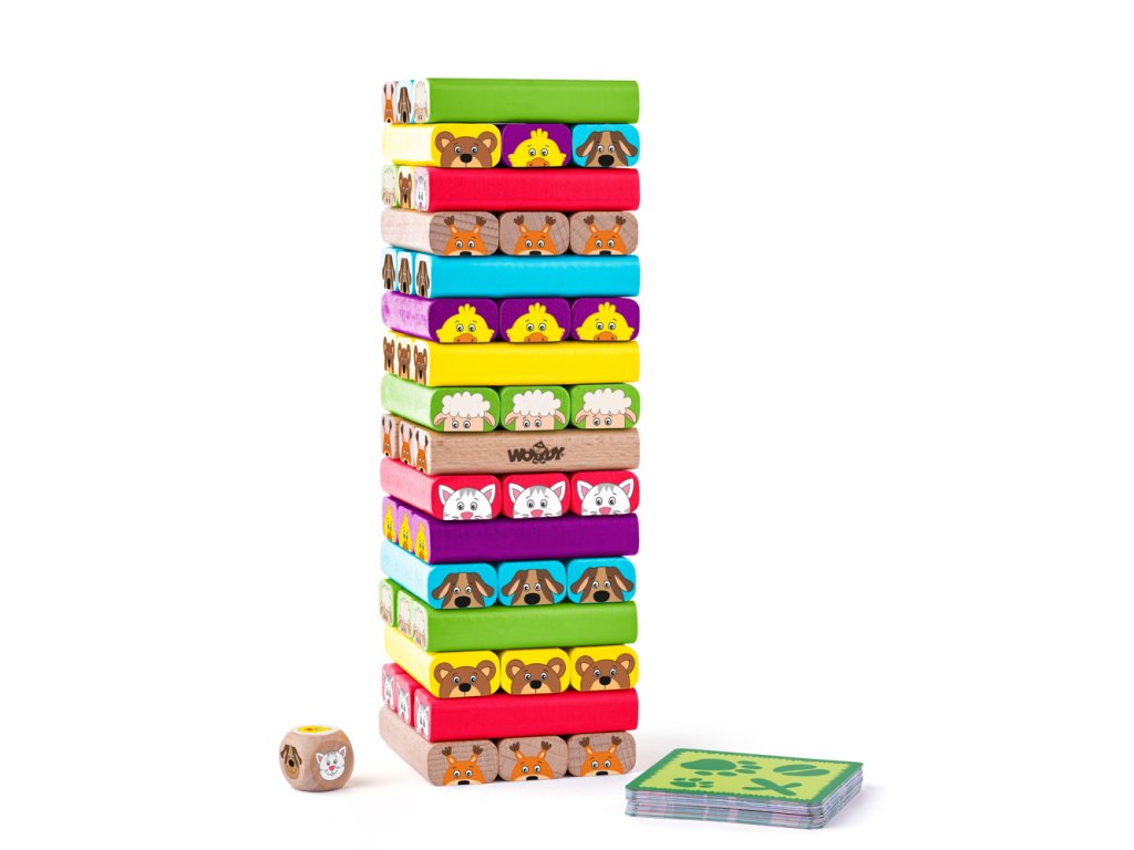 Napínavá hra pro celou rodinu. Hráči hází kostkou. Každé kolo postupně vytahují z věže hrací kameny s tím zvířátkem, které jim padne na hrací kostce. Kámen, který vytáhnou, položí navrch věže tak, aby věž nespadla. Obtížnější variantou je verze, kdy hráči vytahují z věže hrací kameny podle obrázků na kartách. Ty vytahují z hromádky, kterou umístí uprostřed stolu. Na kartách objeví nejen obrázky daných zvířat, ale i jejich siluety nebo obrázek potravy, kterou dané zvíře jí. Musí pak přemýšlet nad tím, kterýpak kámen to mají vlastně vytáhnout. Obsahuje: 52 dílků. Rozměr věže: 23 x 7,5 cm. Rozměr balení: 8,5 x 8 x 27 cm. Věk: 4+
