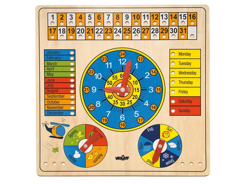 S touto hračkou se dítě učí používat kalendář, kde si ručně nastavuje hodiny, datum, den v týdnu, roční období a počasí. Anglická verze. | Věk: 5+ | Rozměry: 36 x 36 cm | Hračka roku 2009