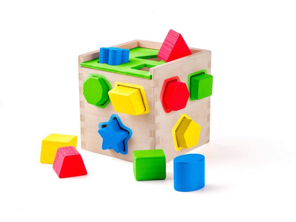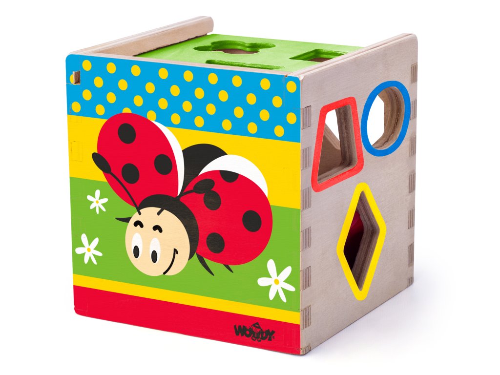 Tato vkládací krabička je vyrobena tak, aby dítě mohlo prostrčit daný tvar pouze příslušným otvorem. Žádný z obsažených tvarů neprojde jiným otvorem, než kterým je určeno. Pomocníkem pro dítě budou i barvy. Každý otvor je ohraničen barvou příslušného tvaru. Na víku tyto barevné pomocníky nenajde a může to tedy zkusit i bez nich. Po vložení všech tvarů vysune víko a může vkládat znovu. Věk: 2+ | Rozměr: 13,5 x 13,5 x 14 cm