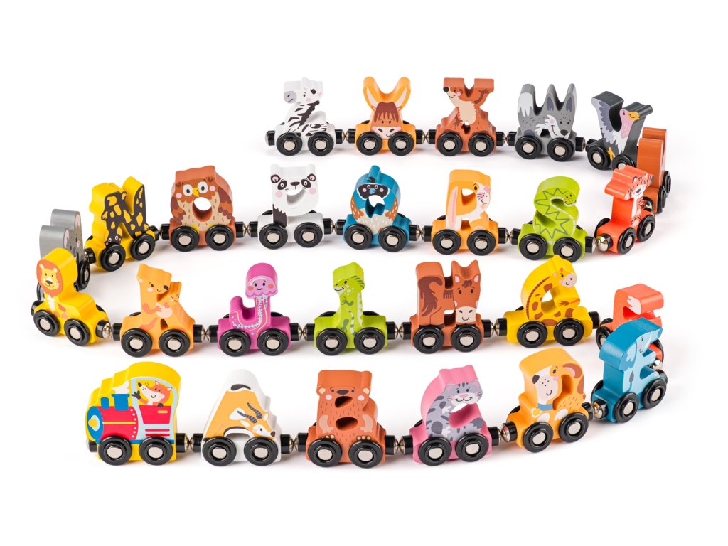Tento barevný dřevěný vláček s abecedou potěší všechny malé objevitele písmenek i zvířat. Sada obsahuje 27 dílů – lokomotivu a vagonky ve tvaru písmen, které jsou spojeny klasickými magnety. Každé písmeno má podobu zvířátka a na druhé straně jeho anglický název, takže si děti při hře nenápadně osvojují základy angličtiny. Děti si navíc mohou hravě skládat jednotlivá písmena do slov, rozvíjet tak svou kreativitu a učit se číst. Abeceda je krásně barevná, hravá a originální – její jedinečný design pochází od české autorky. Ideální hračka pro rozvoj fantazie, jemné motoriky i jazykových dovedností. Rozměry jednoho vagonku cca: 6,3 x 6,5 x 2,5 cm. Celková délka vláčku: 179 cm. Rozměry balení: 32 x 47 x 37,5 cm. Věk: 3+