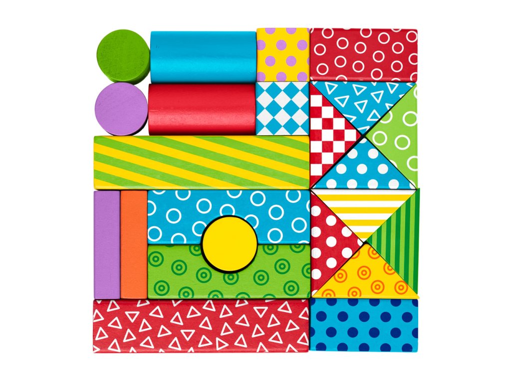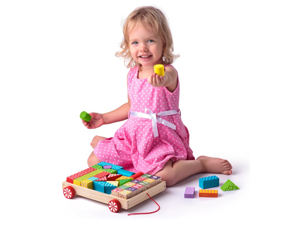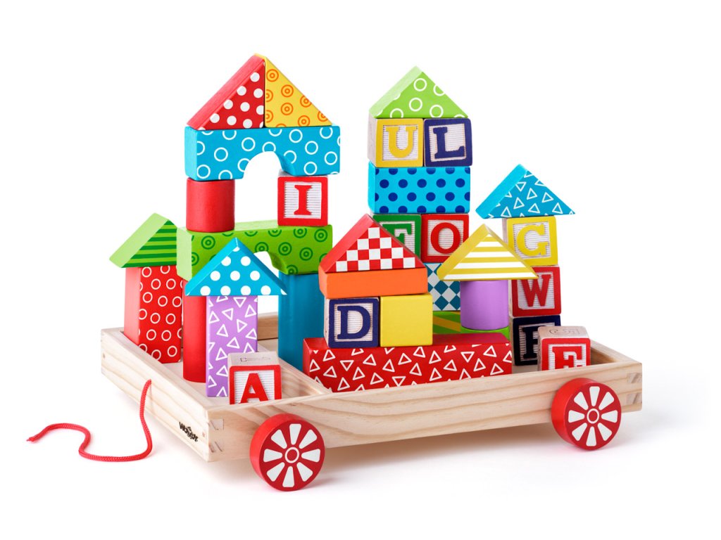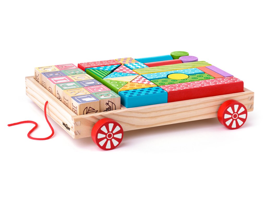 36ti dřevěných kostiček umístěných v dřevěném vozíku. 12 z nich je ze dvou stran barevná a je plasticky provedena tak, aby mohla sloužit po namočení do tiskařského polštářku i jako razítko. Ostatní kostky jsou v barevném provedení s potiskem. | Věk: 3+ | Rozměr: 27 x 24 x 6 cm