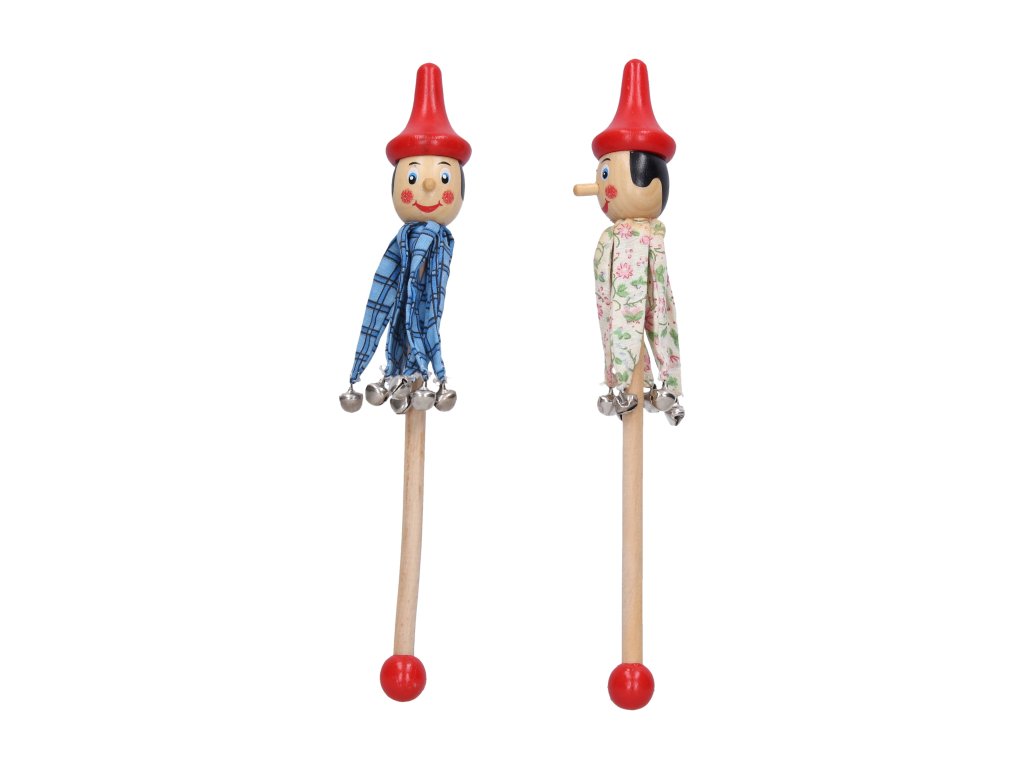 Loutka Pinocchio. Velikost 24 cm. Dřevo a textil. s rolničkami, více variant