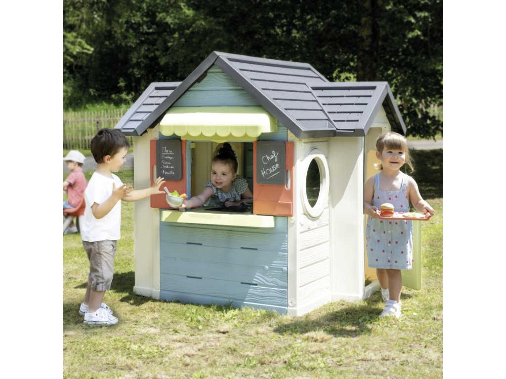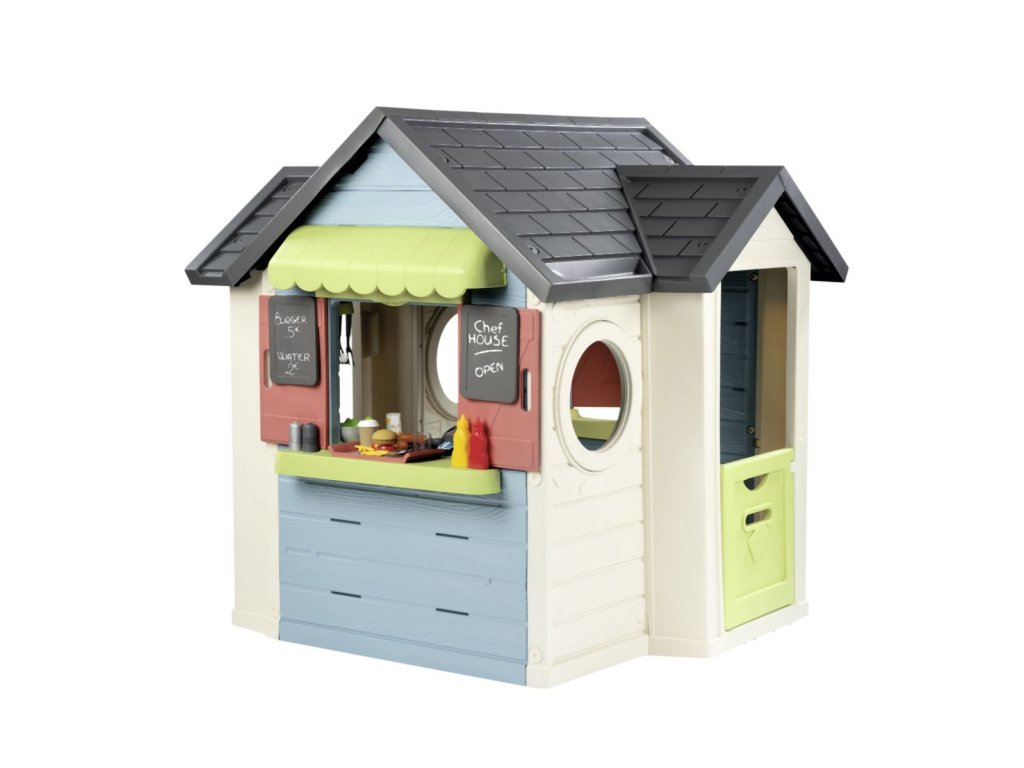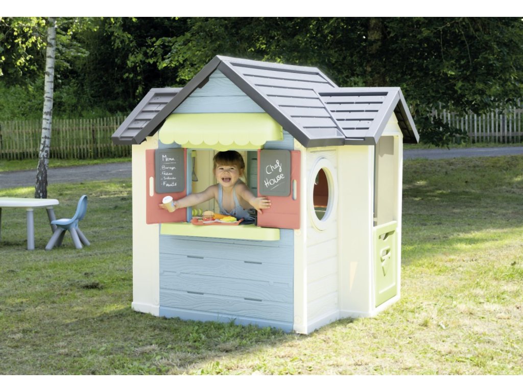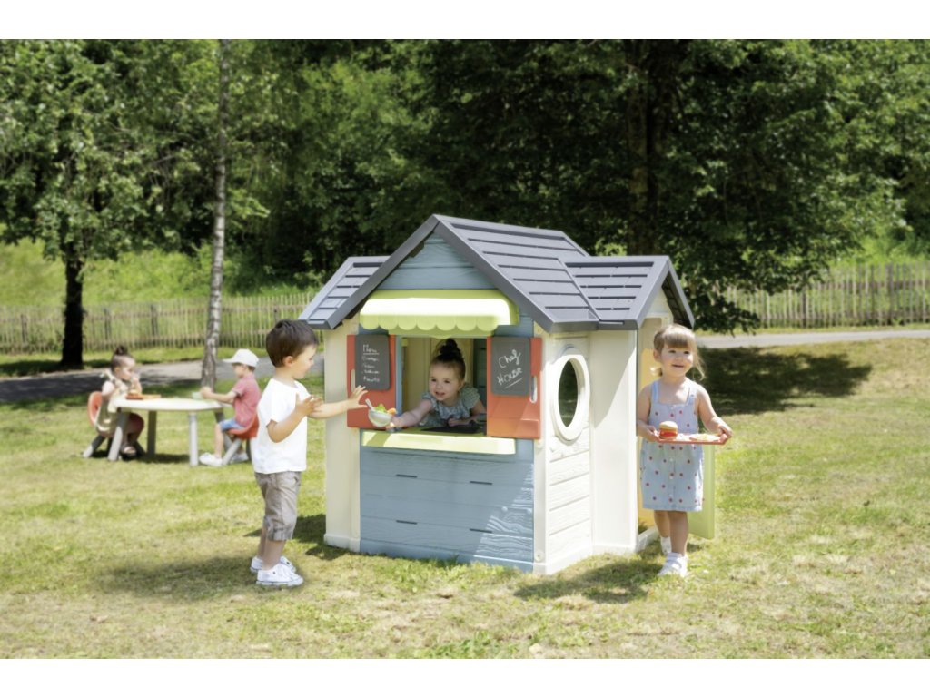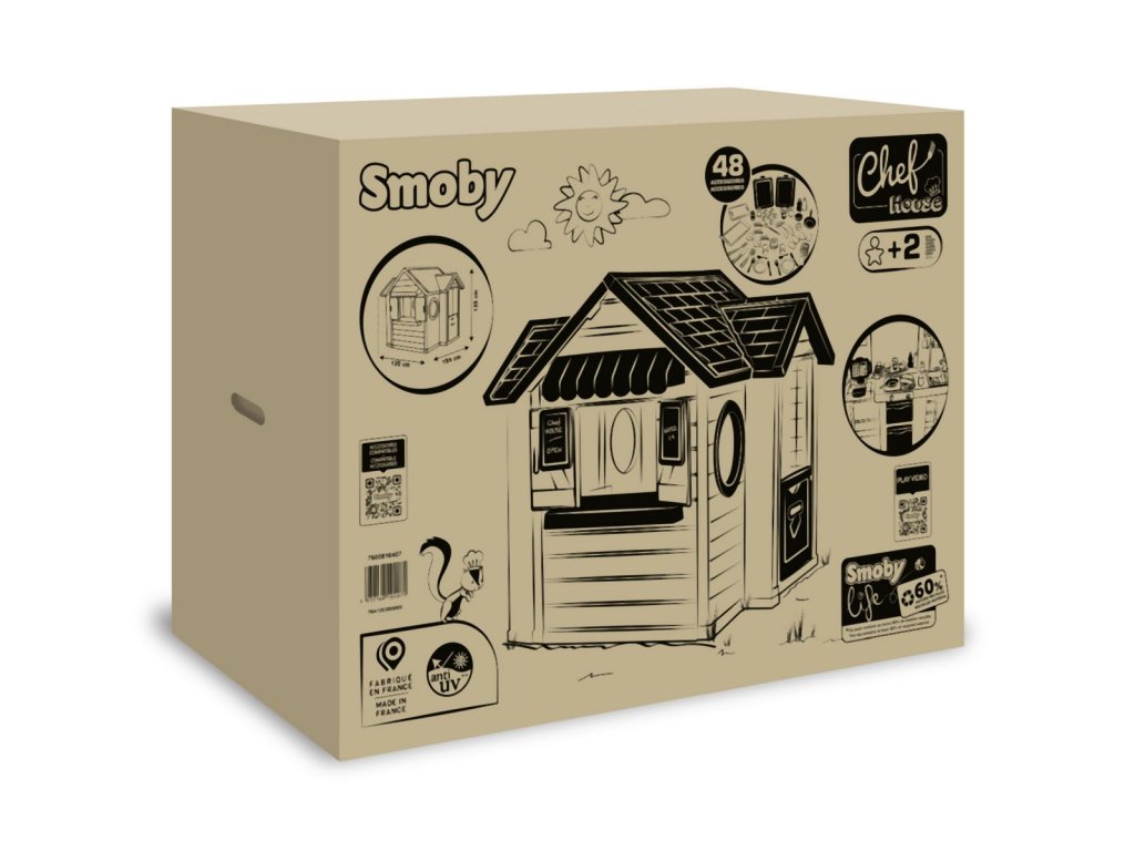 Domeček Chef kombinuje zahradní domeček, restauraci a obchod. S pultem, markýzou, malou kuchyňkou, pokladnou, herním jídlem a další. Domeček má malé vstupní dveře a dvě okna s otočnými žaluziemi. Disponuje dvěmi tabulemi, na které lze napsat menu nebo otevírací dobu. Součástí příslušenství je lednice, trouba, plynový gril s pohyblivými plameny, dřez s kohoutkem, dvě police, pokladna s kalkulačkou a čtečkou kreditních karet, vč. karty. K dispozici jsou také sladká a slaná jídla, kečup, omáčky, pánvička se snadným otáčením s palačinkou, slánka a pepřenka s „cvaknutím“, příbory a nádobí. Stabilní robustní odolný plast s ochranou proti UV záření. Obsahuje celkem 48 kusů příslušenství. Domeček je kompatibilní s veškerým příslušenstvím, kromě komína. Výška dveří od země 46,3 cm. Tento výrobek obsahuje minimálně 60 % recyklovaného materiálu. Rozměry sestaveného domečku: 124 x 132 x 135 cm (DxŠxV).