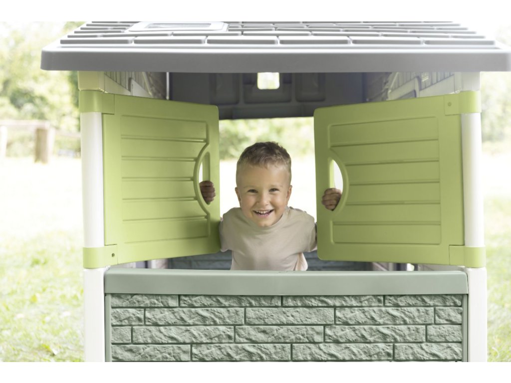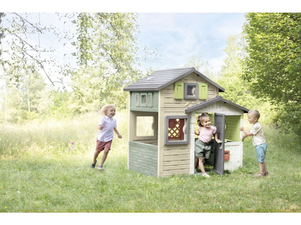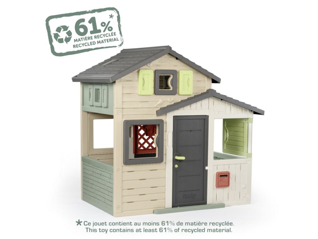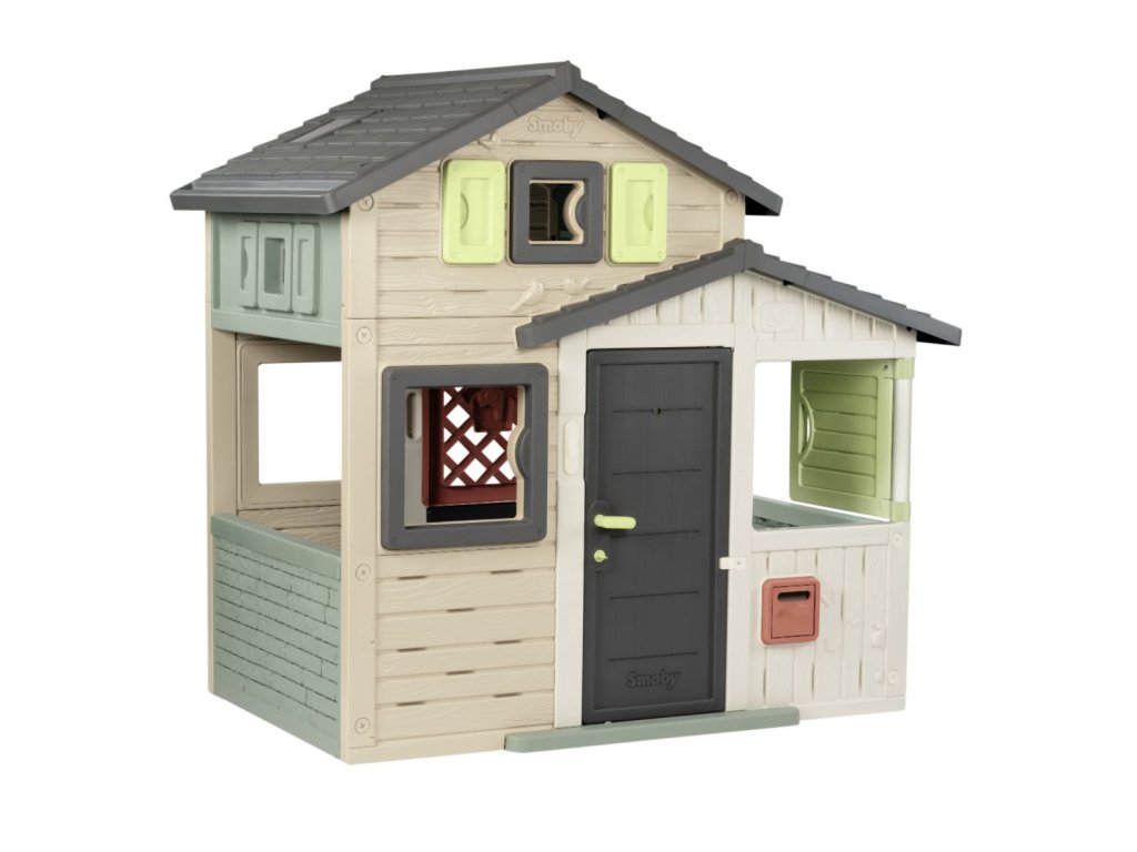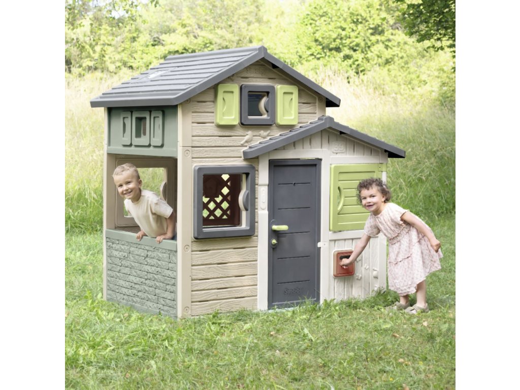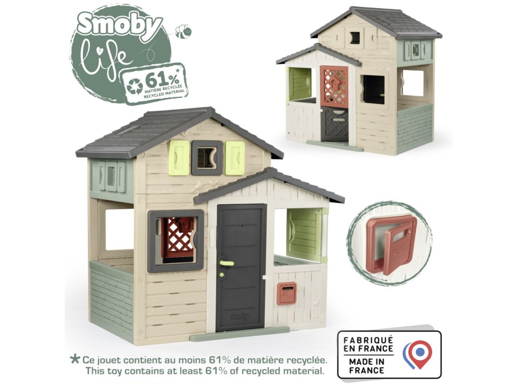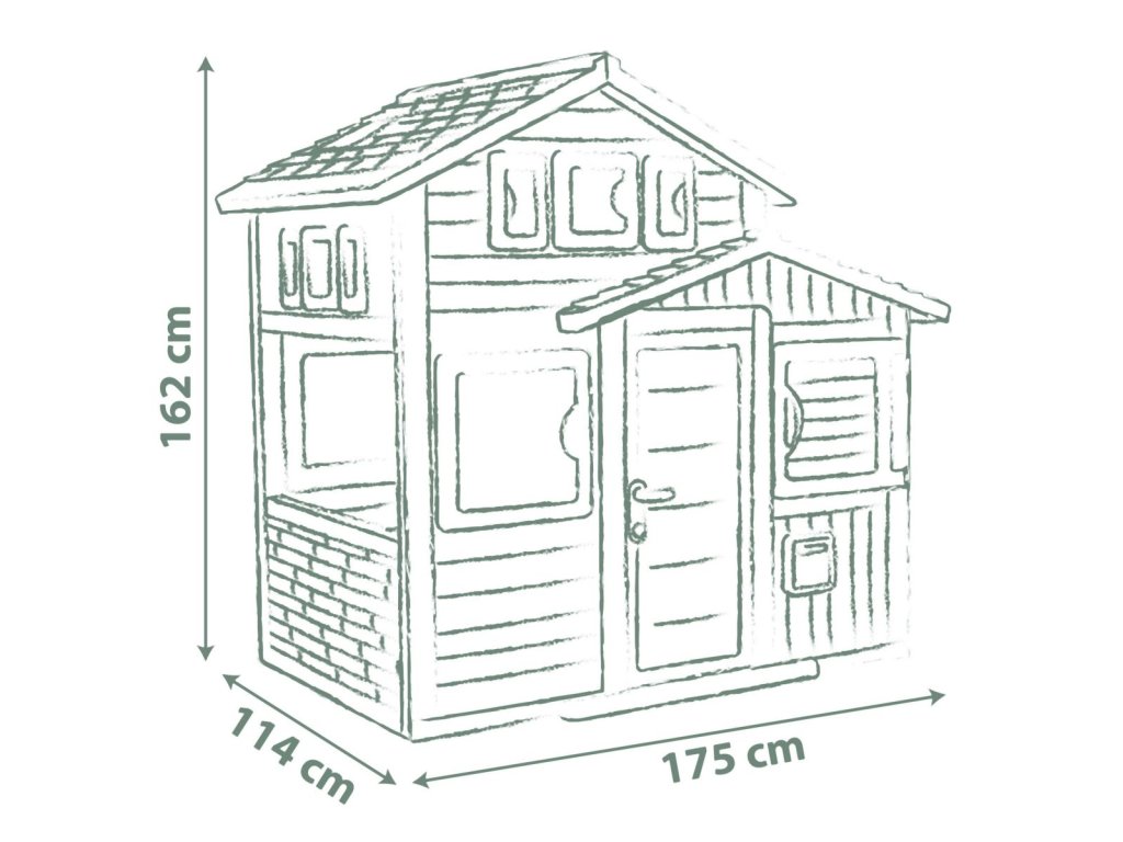 Prostorný zahradní domeček s výškou 1,62 m má přední plné dveře s kukátkem a zadní poloviční (sloužící jako tajný průchod), 6 oken, 2 okenice otočné o 360° a funkční poštovní schránku. Domeček lze rozšířit o další příslušenství. Tento výrobek obsahuje minimálně 61 % recyklovaného materiálu a je 100 % recyklovatelný. Plastové díly jsou ošetřeny proti UV záření pro dobrou odolnost a delší trvanlivost barev v průběhu času. Tento dům byl navržen tak, aby vyhovoval všem doplňkům Smoby, jako je letní kuchyně, piknikový stůl, sběrač vody, dobíjecí lampa nebo zvonek. Rozměry domečku (DXŠXV): 175 x 115 x 162 cm.