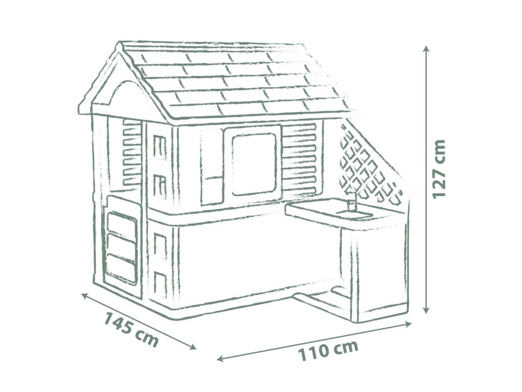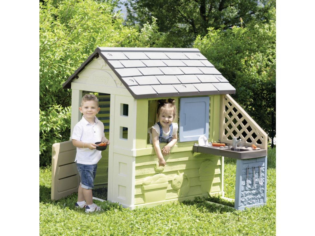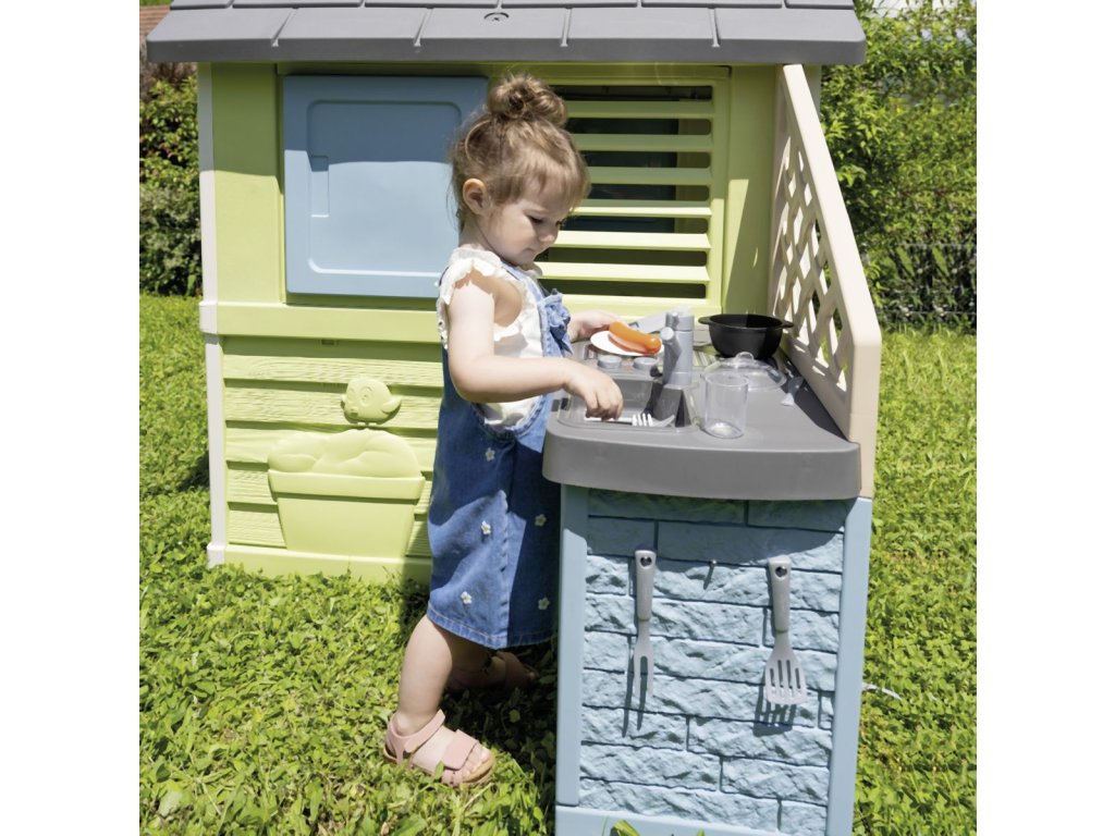 Stabilní, prostorný domeček Smoby Life Pretty se skvělou letní kuchyňkou nabízí spoustu zábavy pro nejmenší. Kuchyňka je připevněna ke vnější stěně, má dřez s kohoutkem (nefunkční), grilovací desku na vaření a grilování a polici na nádobí. Zážitek z vaření doplňují 2 sklenice, 2 talíře, různé kuchyňské náčiní, klobásy a malý rendlík. Snadná montáž. Módní barevné provedení v tyrkysové a zelené dodává zahradnímu domku svěží a moderní vzhled. Čtyři robustní boční stěny jsou navrženy velmi detailně, motýli a malá kočka zdobí fasádu a vytvářejí zábavný design. Vybavení domu doplňují 2 okna s lamelami, 2 posuvná okna s možností otevírání a zavírání a malé vstupní dveře. Domeček je vyroben z vysoce kvalitního plastu odolného vůči UV záření a je zvláště odolný vůči povětrnostním vlivům a vyblednutí. Tento výrobek obsahuje minimálně 57 % recyklovaného materiálu. Rozměry produktu (DxŠxV): 145 x 110 x 127 cm.