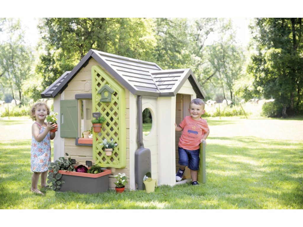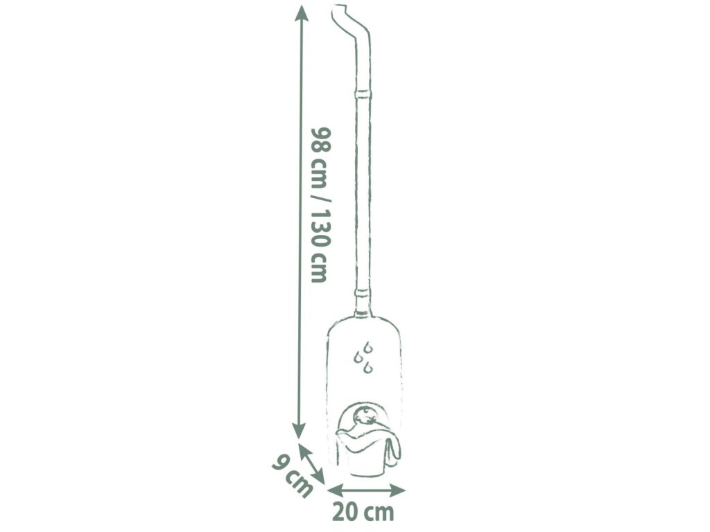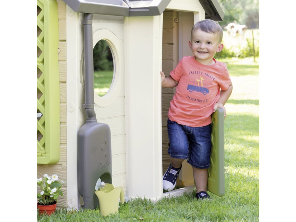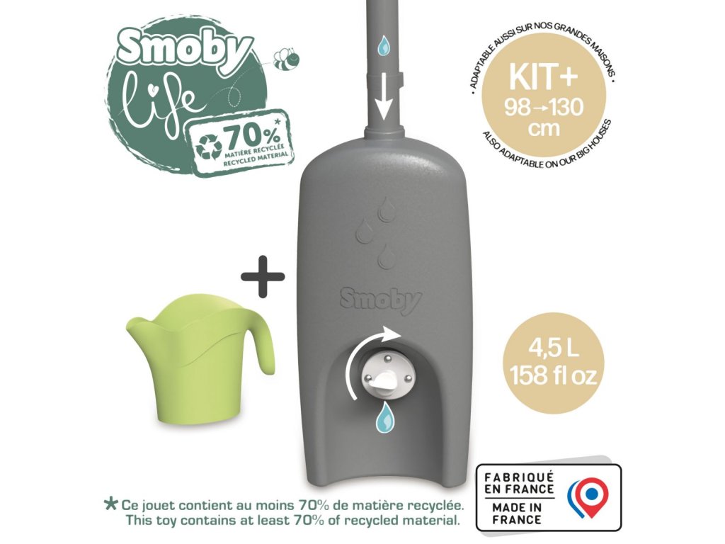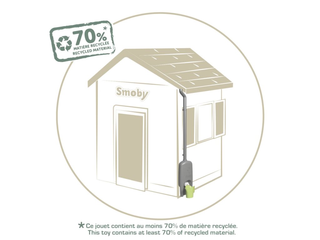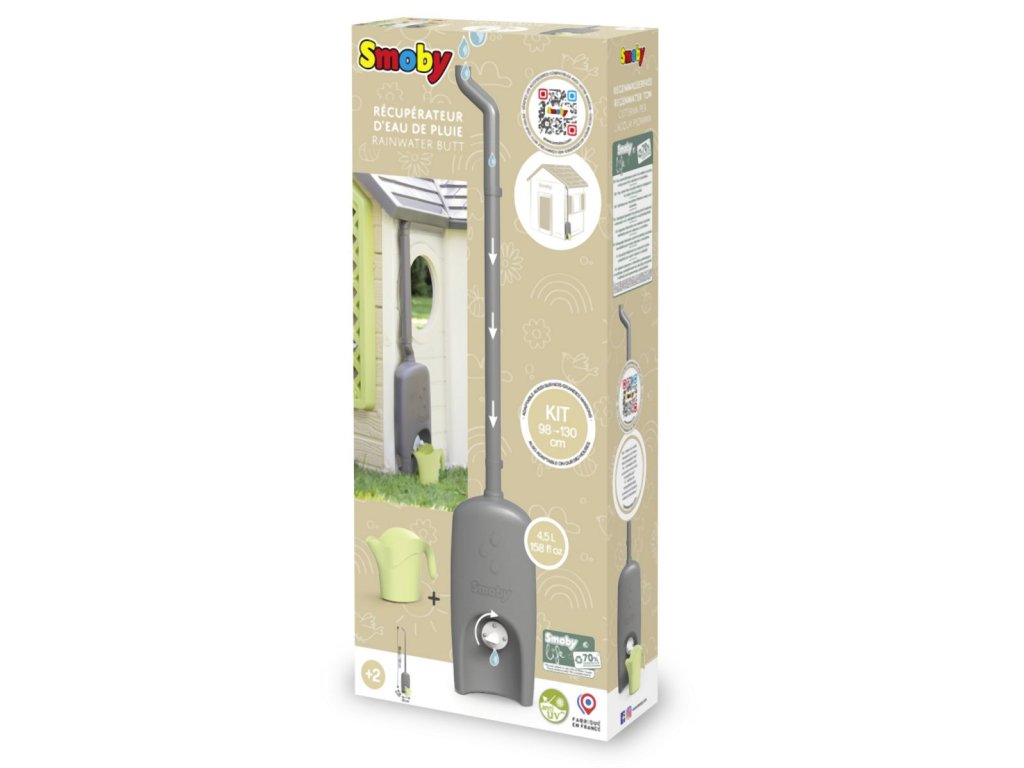 Okap s nádrží na dešťovou vodu s konvičkou jako doplněk pro vybrané domečky Smoby. Nádrž na vodu (4,5 l) se velmi snadno instaluje na domečky Smoby a dešťová voda se pak shromažďuje odvodňovacím žlabem. Pomocí velkého, praktického šroubového ventilu pak mohou děti nalít vodu do konve a používat ji k zavlažování. Anti-UV ošetření zaručuje dobrou odolnost a trvanlivost barev. Tento výrobek obsahuje minimálně 70 % recyklovaného materiálu. Rozměry (DxŠxV) 9 x 20 x 98,5-130 cm.
