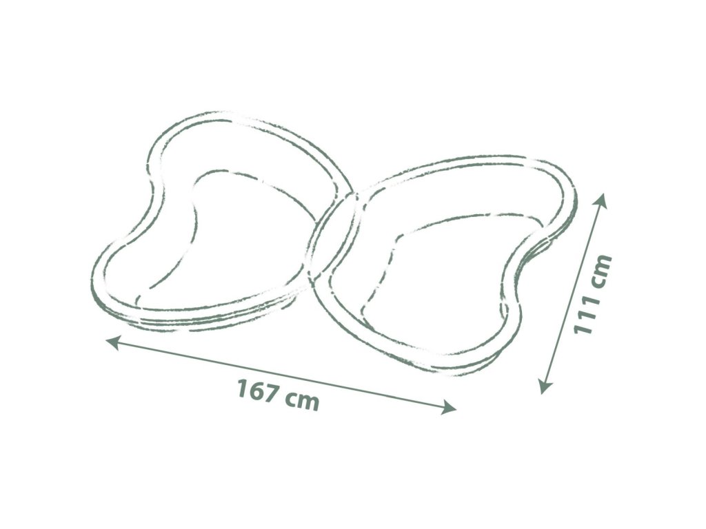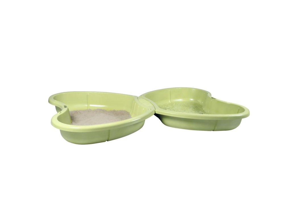 Zelené pískoviště ve tvaru motýla skládající se ze dvou do zebe zapadajících částí. Jedna část může být naplněna pískem a druhá vodou. K vodní trysce v prostřední části může být připojena zahradní hadice. K pohodlnému vypuštění vody z nádoby slouží vypouštecí zátka. Plastové díly jsou ošetřeny anti-UV, což zajišťuje dobrou odolnost a stálost barev v průběhu času. Tento výrobek obsahuje minimálně 96% recyklovaného materiálu. Rozměry rozloženého pískoviště (DxŠxV): 167 x 111 x 18 cm.