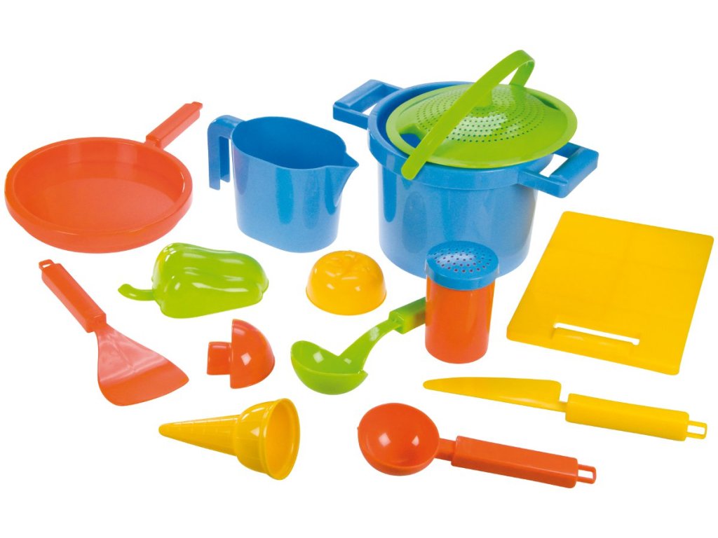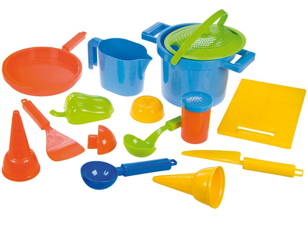 Lena Pískový set k vaření. Set k vaření se skládá ze sítko/poklička, hrnec, 3x zelenina, solnička, naběračka, obracečka, nůž, prkénko, pánev, odměrka, kornoutek, zmrzlinová naběračka. Celkem 14 dílů. Pro holky i kluky od 2 let.