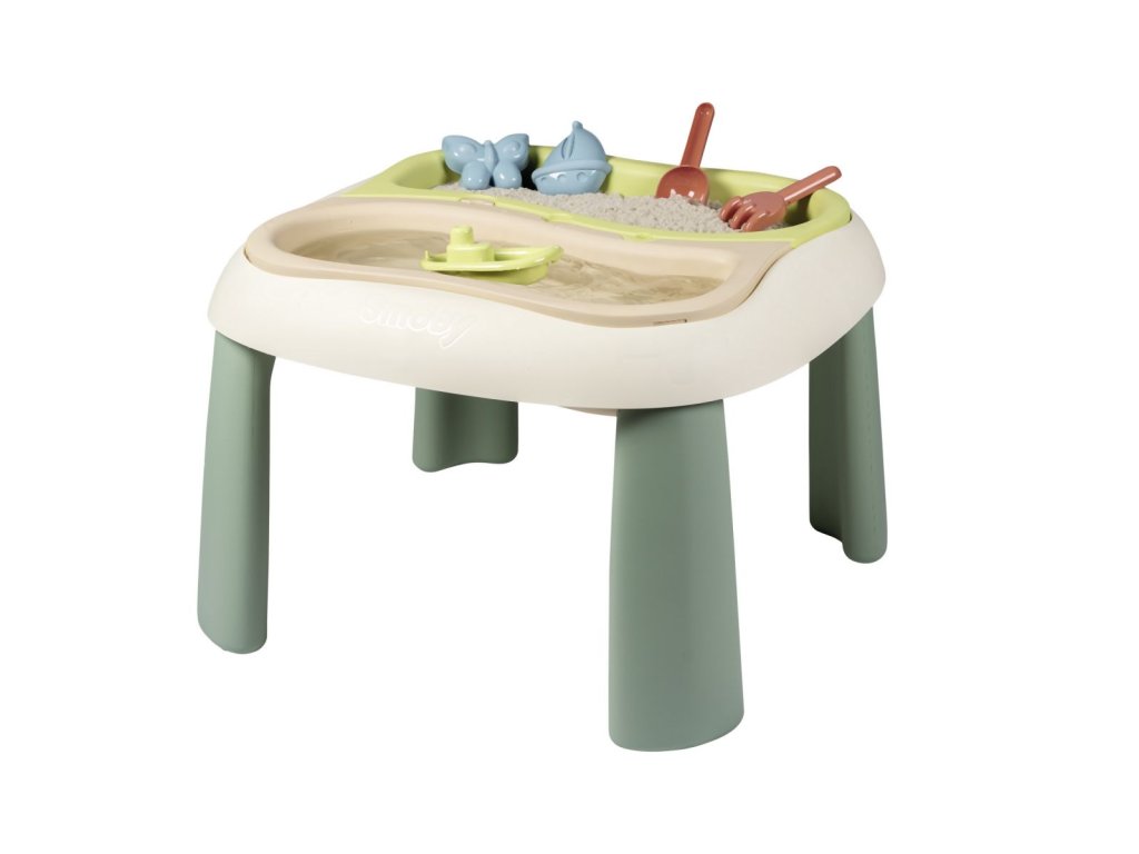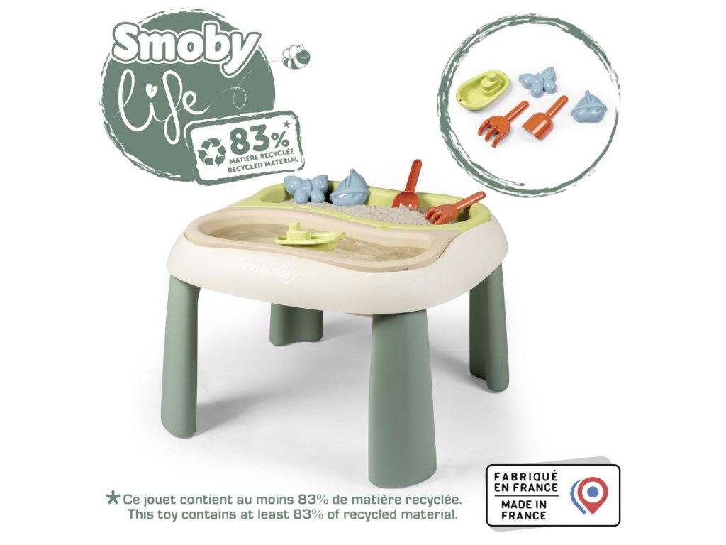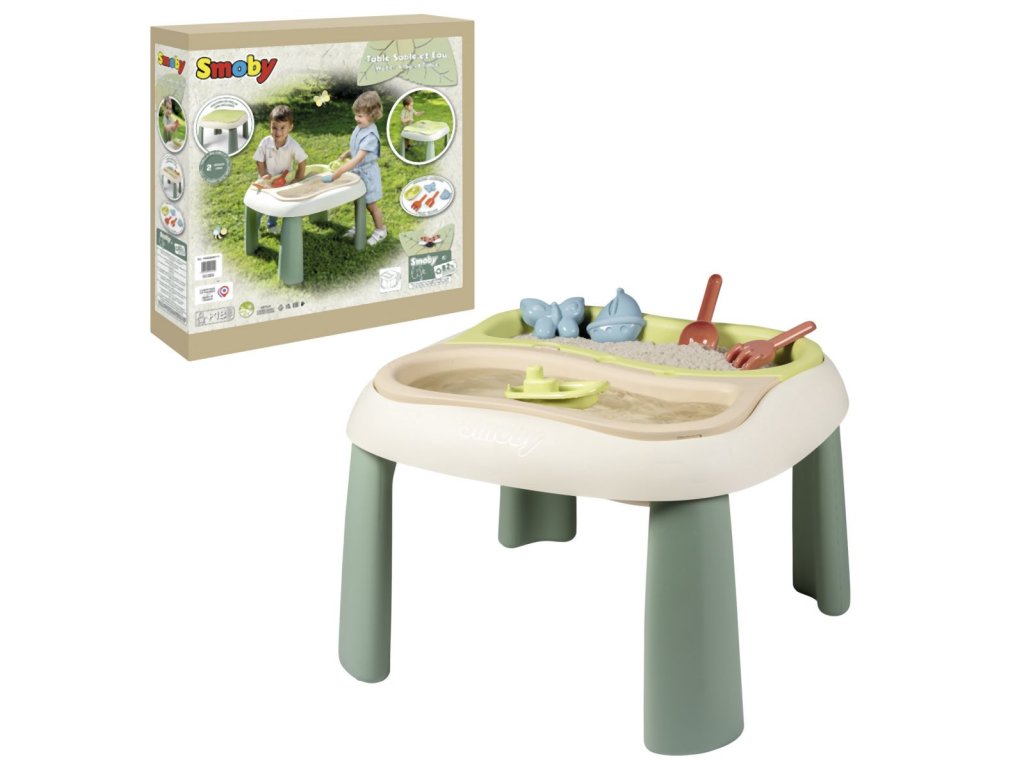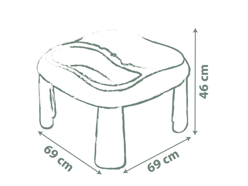 Venkovní stoleček z kvalitního, robustního plastu. Součástí stolu jsou dva vyjímatelné boxy na písek a vodu, lodička, hrabičky, lopatička a 2 formičky na písek. Dodáváno i s ochranným víkem (2 části). Vhodný i do prostor s nedostatkem místa.Uprostřed stolu otvor pro slunečník (není součástí balení). Plastové díly jsou ošetřeny anti-UV, což zajišťuje dobrou odolnost a stálost barev v průběhu času. Tento výrobek obsahuje minimálně 83% recyklovaného materiálu. Rozměry: 69 x 46 x 69 cm. Hmotnost cca 4,5 kg.