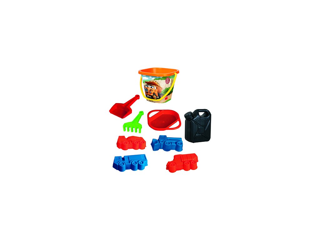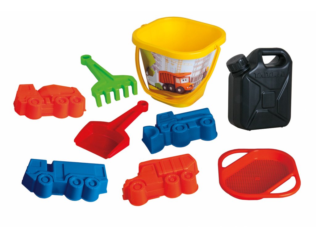 Pískový set, který obsahuje kyblík se sítkem, hrabičky s lopatkou, 4 bábovky Tatra a kanystr