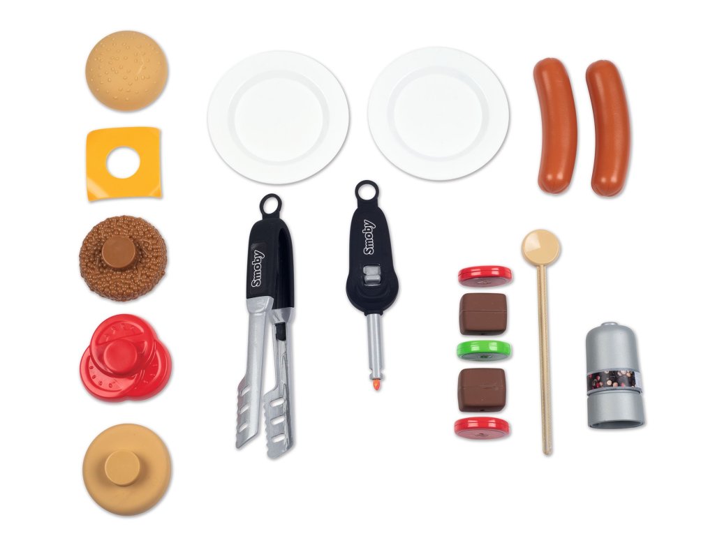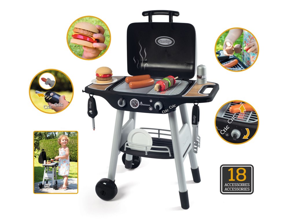 Zahradní gril s víkem. Součástí grilu je grilovací náčiní a potraviny pro přípravu pochoutek. Magický systém se zatahovacími plameny. Obsahuje 18 ks příslušenství. Rozměry: 50 x 72,2 x 37 cm.