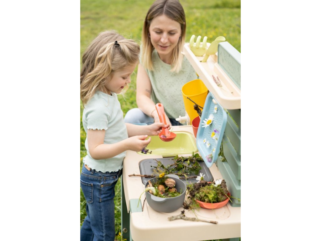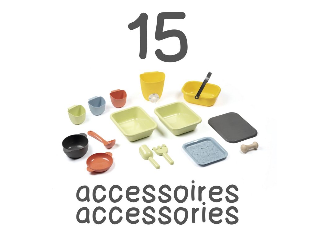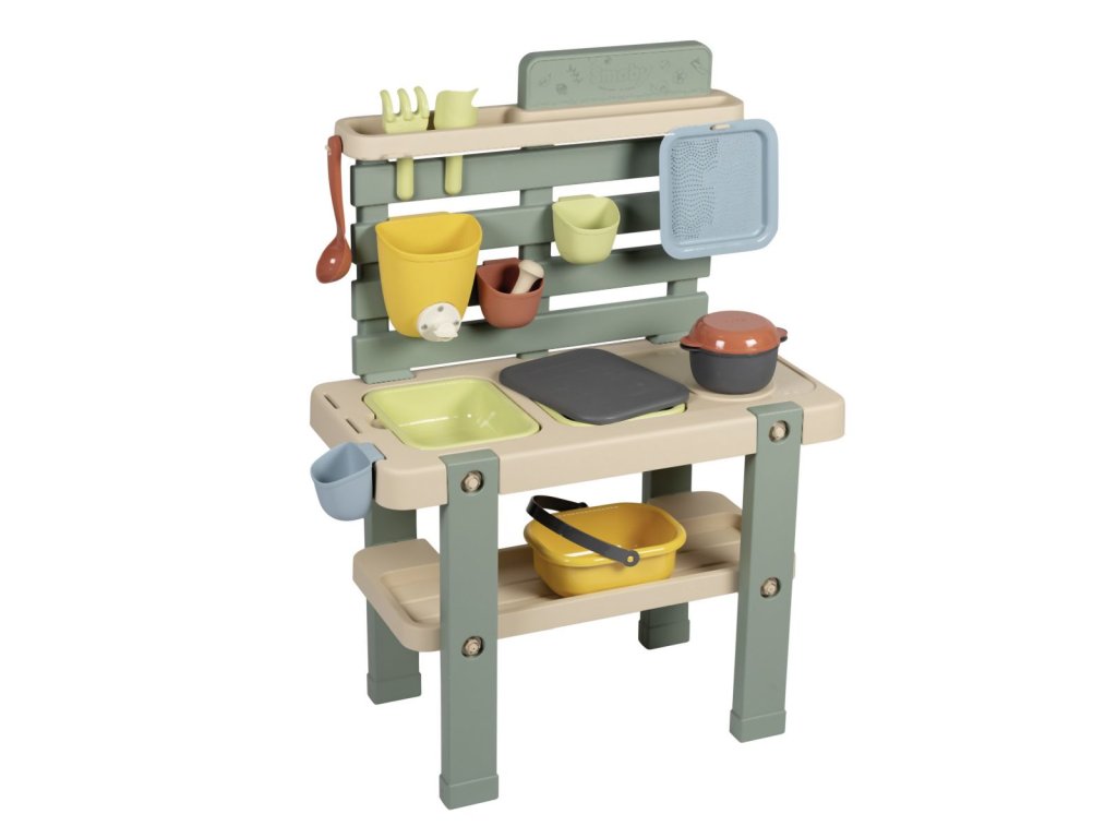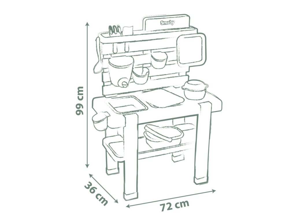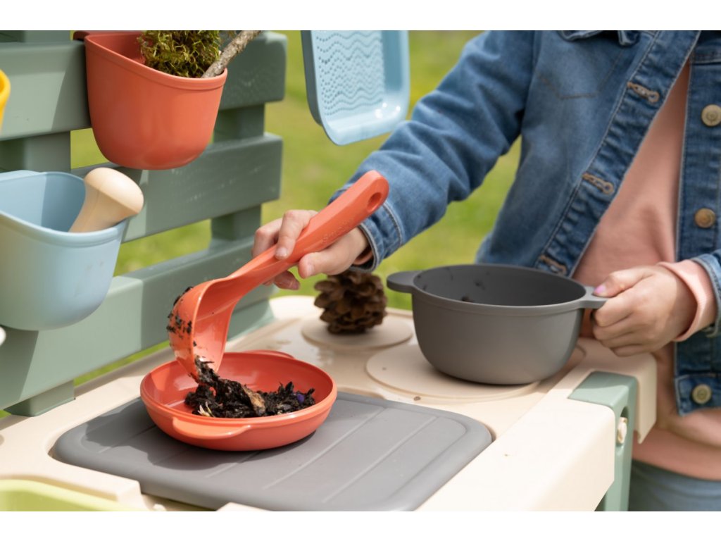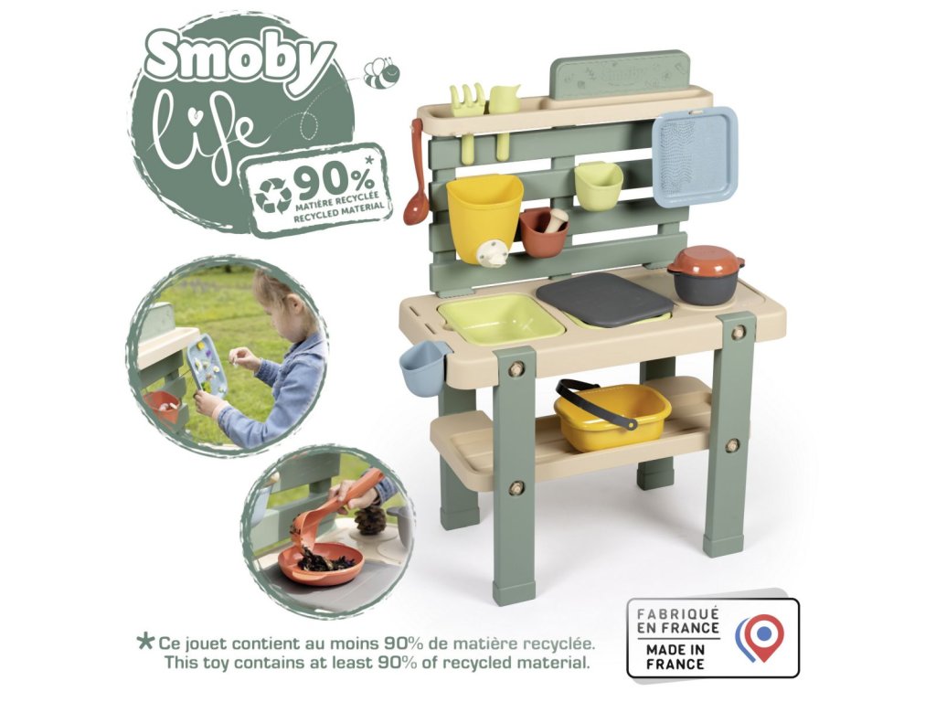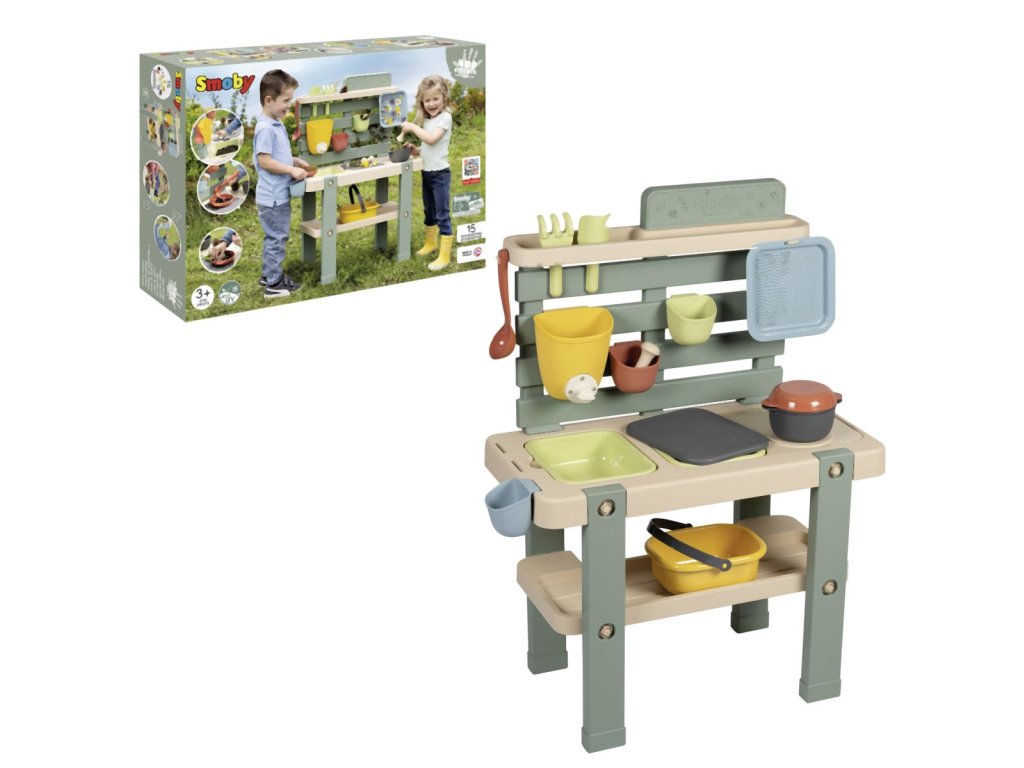 Venkovní kuchyňka vybavená různým příslušenstvím, celkem 15 ks doplňků. Plastové díly jsou ošetřeny anti-UV, což zajišťuje dobrou odolnost a stálost barev v průběhu času. Tento výrobek obsahuje minimálně 90% recyklovaného materiálu. Rozměry výrobku (DxŠxV): 72 x 36 x 99 cm.