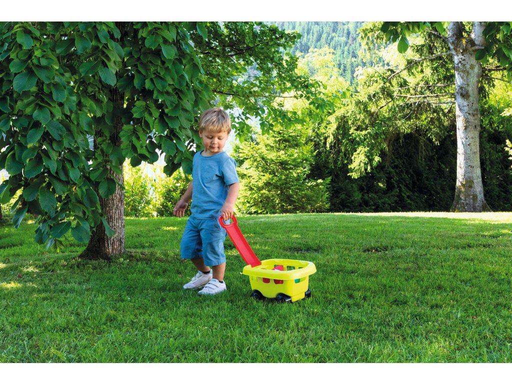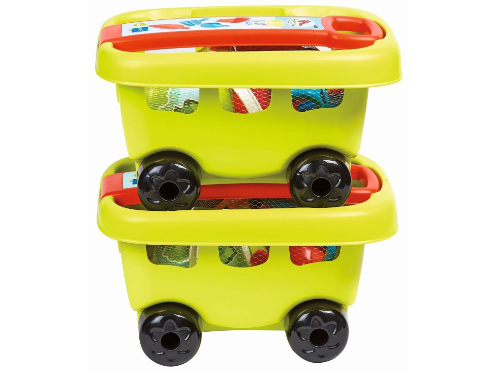 Ruční zahradní vozík s příslušenstvím v kyblíčku. S kyblíčkem na písek, sítem, konvičkou, lopatkou, hrabičkami a formičkou na písek. Vozík se snadno ovládá díky praktickému táhlu. Rozměry produktu (DxŠxV): 31 x 19 x 17,5 cm.