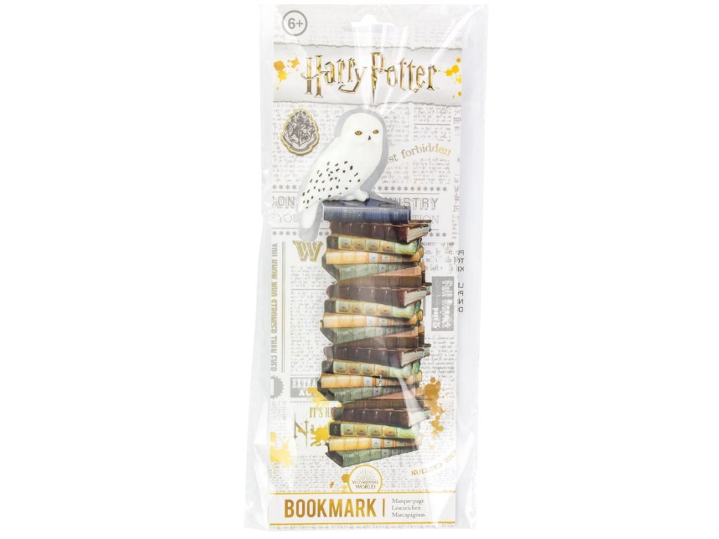 3D knižní záložka s motivem knih a sovou Hedvikou z filmu Harry Potter.