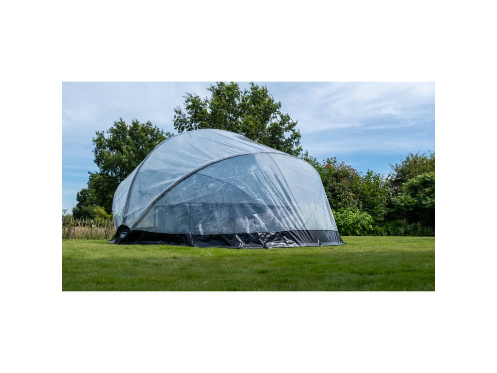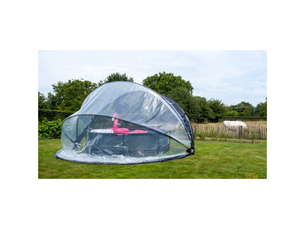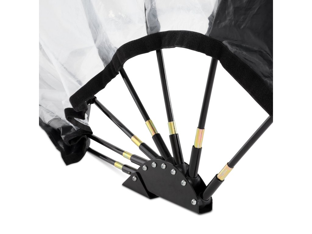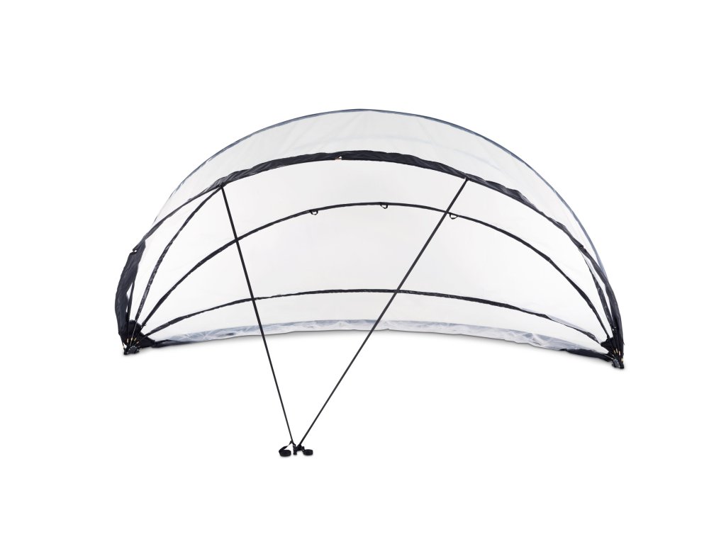Zastřešení lze rychle a snadno postavit ve dvou lidech. Po instalaci můžete kryt snadno zavřít, nebo nechat v polootevřené poloze díky nastavitelným popruhům.